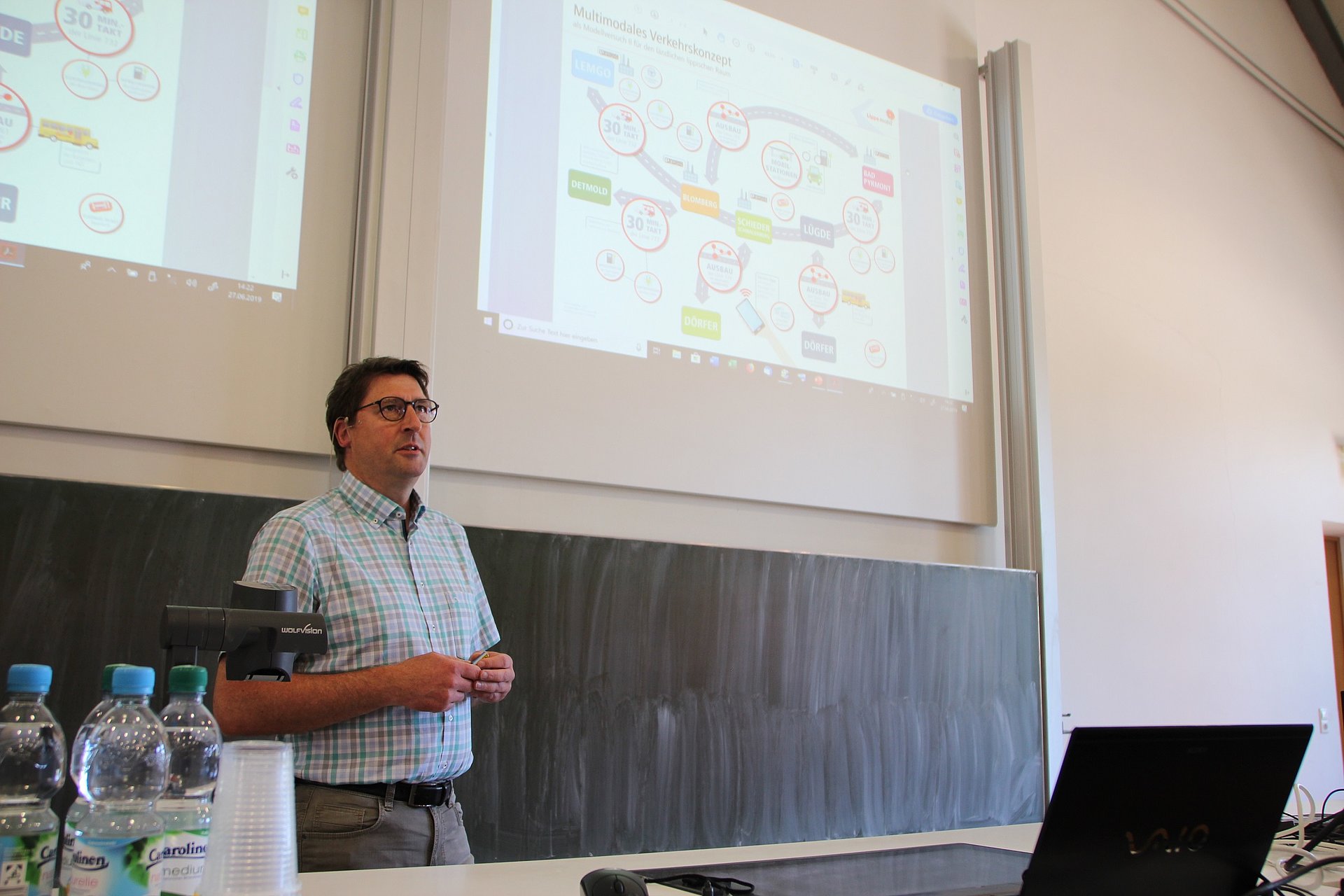Frau BA Bicker stellte in einem weiteren Vortrag das Angebot von Elektrorollern vor, die von moBiel unter dem Namen "Alma" gemietet werden. Sie berichtete über eine Reihe von bisher gemachten Erfahrungen. Herr Oberwöhrmeier, Geschäftsführer der KVG Lippe, präsentierte in seinem Vortrag das multimodale Verkehrskonzept für den Kreis Lippe, bestehend u. a. aus Schnellbuslinien, angebundenen Bussen im Richtungsbandbetrieb, Bürgerbussen, Mobilstationen (Car- und Bikesharing-Angebote). Herr Kunde, Fa. Mentz/München, erläuterte in seinem Vortrag zum Thema "Mit einer App von Tür zu Tür" die Integration verschiedener Datenbanken der Mobilitätsdienstleister, die Fahrplanauskunft und den Buchungs-/Ticketing-Prozess. Abschließend stellte Herr Wehrmann, Leiter der Stabstelle Mobilität und Projekte bei der Stadt Detmold, den vorgesehenen Multi Modal Hub vor. Hierbei sollen in einem Parkhaus zusätzliche Angebote wie Bike- und Carsharing, Bike Safe und City Logistik eingebunden werden.