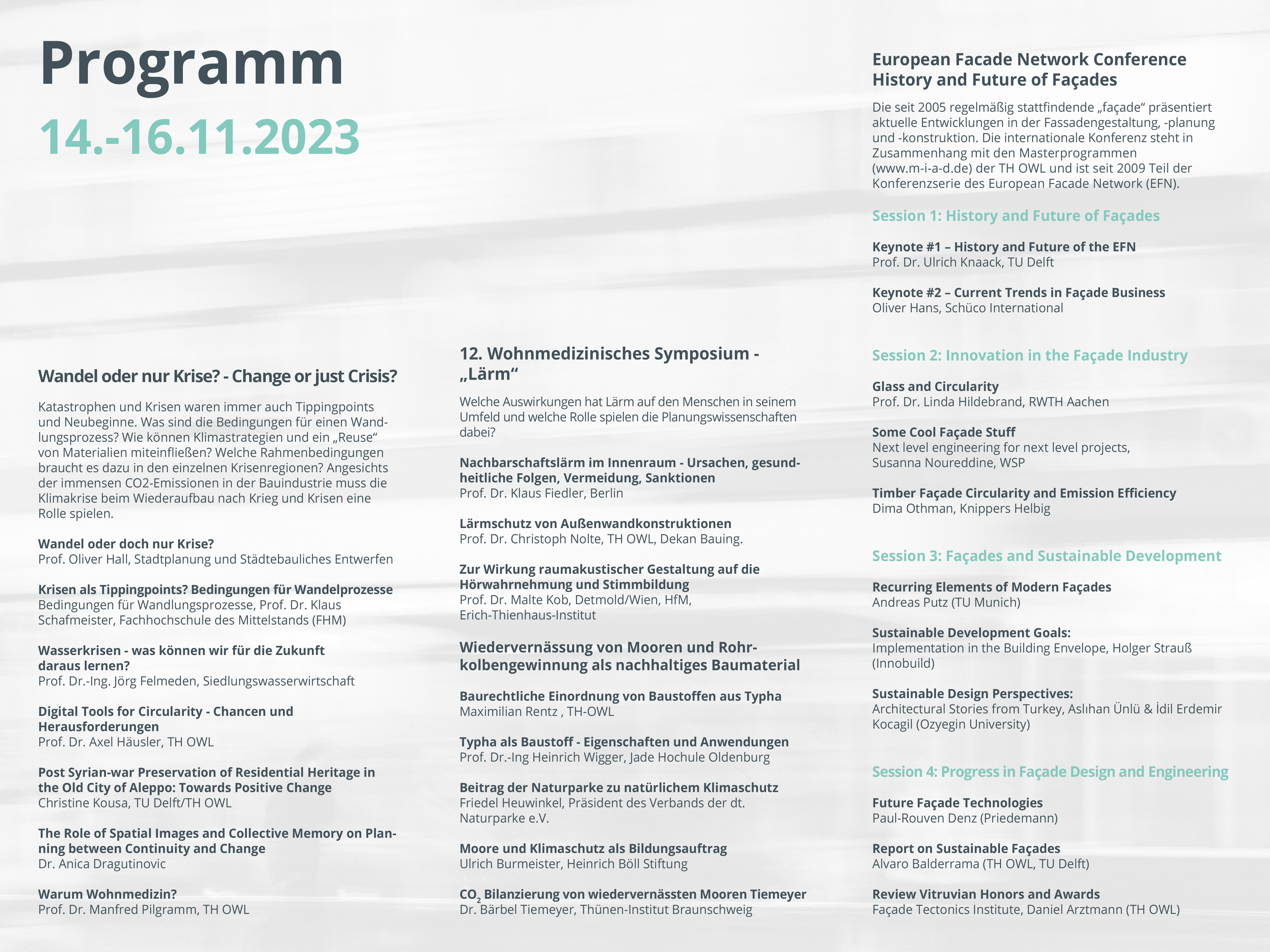 Im November 2023 fand die Detmold Conference Week erneut am Kreativ Campus Detmold statt. Die Veranstaltungen Konferenz unter dem Titel „Wandel oder doch nur Krise?“, dem Wohnmedizinischen Symposium, einem Beitrag zur Wiedervernässung von Mooren und nachhaltigen Baumaterialien sowie dem internationalen Fassadensymposium.