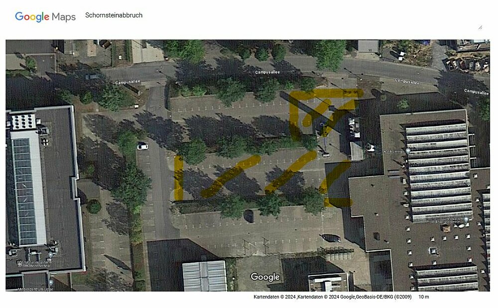 Für den zweitägigen Abbau des Schornsteins wird ein Kran errichtet, zudem benötigen die Firmen Platz für die demontierten Schornsteinelemente sowie für den LKW. Aus diesem Grunde sind die Parkbuchten direkt dem Schornstein gegenüber sowie die gesamte mittlere Parkplatzreihe für die zwei Tage gesperrt (Skizze unten).