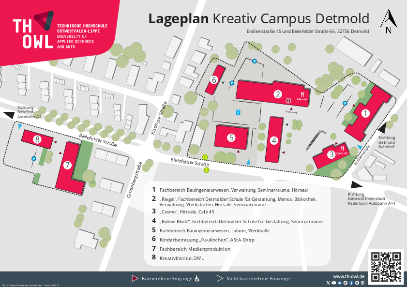 Die Veranstaltung findet auf dem Kreativ Campus Detmold im Foyer sowie im großen Hörsaal in Gebäude 3 (Raum 3.103) statt. Parken können Sie auf dem Gelände des Campus mit Zufahrt durch die Schrankenanlage an der Bielefelder Straße oder Emilienstraße. Bitte klingeln Sie dort und geben an zu welcher Veranstaltung Sie kommen.