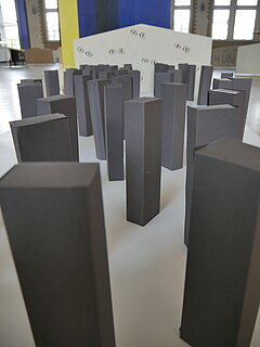 In der Ausstellung wurden außerdem studentische Entwürfe präsentiert aus dem Lehrgebiet Entwerfen unter Leitung von Prof. Jasper Jochimsen. Gezeigt wurden rund 20 Modellvarianten zur architektonischen Gestaltung und städtebaulichen Integration eines Besuchendenzentrums auf dem Gelände Stalag 326.