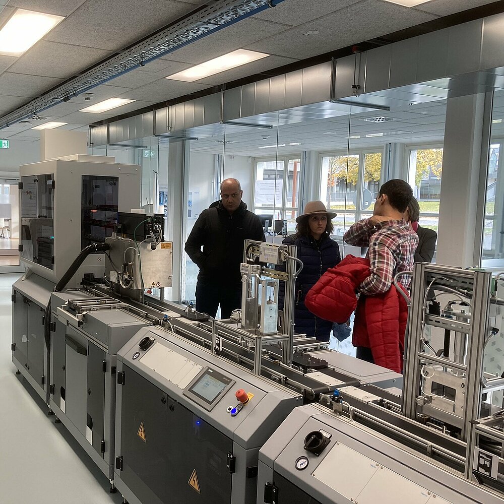 Weitere Beispiele für zukunftsweisende berufliche Bildung lernte die spanische Delegation bei einer Führung über die berufliche Seite des Innovation Campus Lemgo kennen. So stellte Stefan Denk die Cyberphysische Fabrik (CPF) als Lernort für die Industrie 4.0 vor. Das Institut für Kunststoffwirtschaft OWL (ikuowl) als sogenannten Dritten Lernort stellt Karsten Kießler vor.