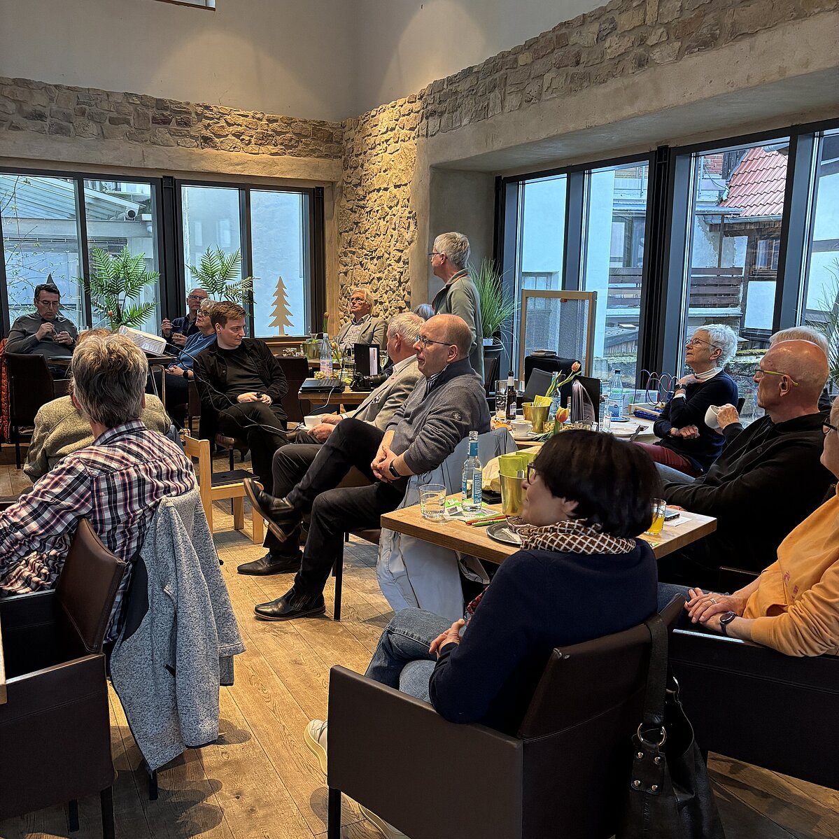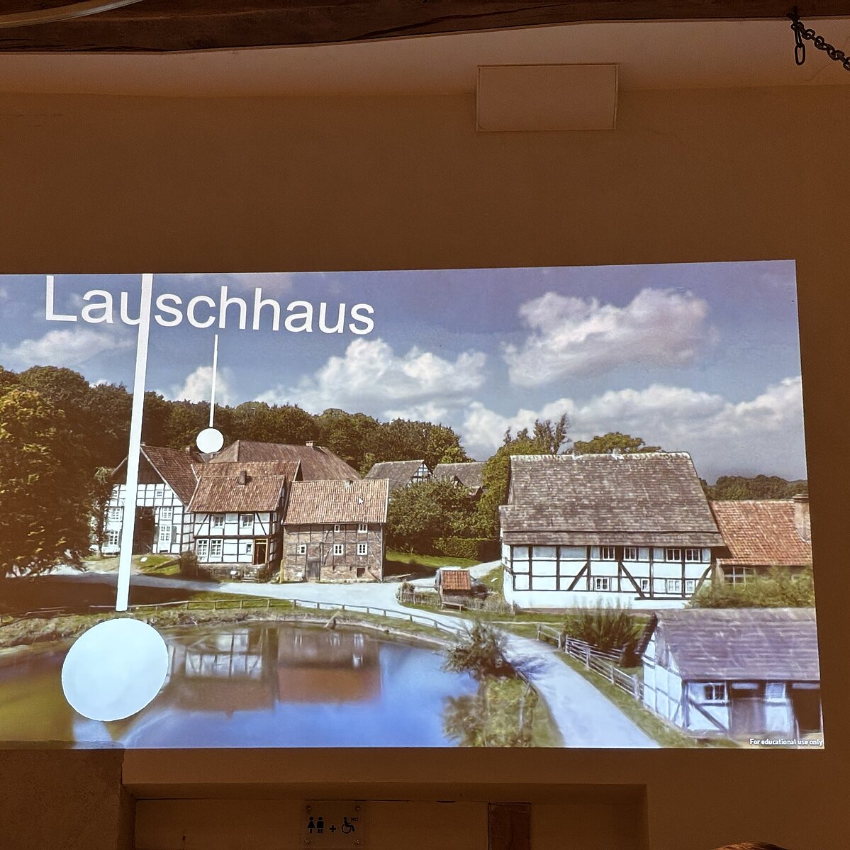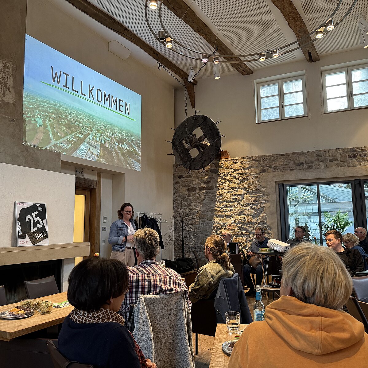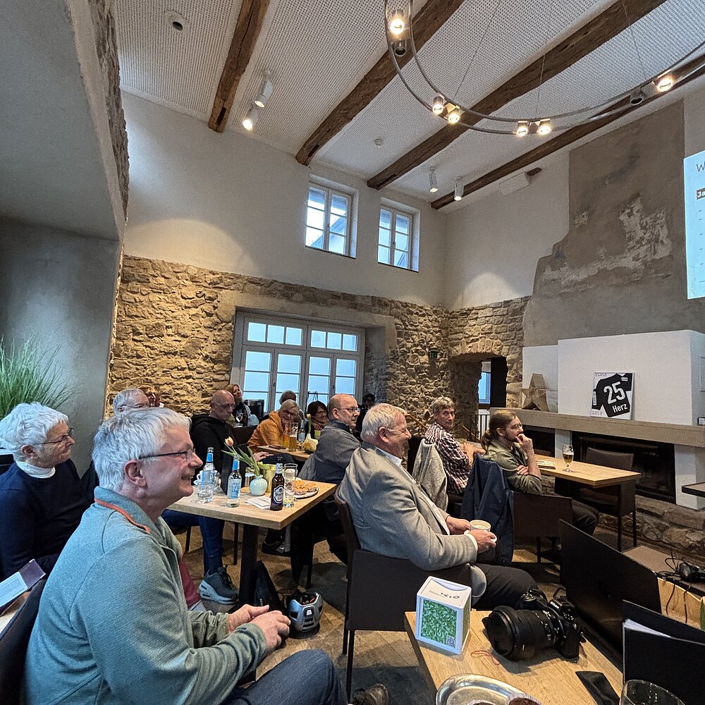 Nachdem zunächst die Entwicklung von den Anfängen des ersten Computers zum heutigen Smartphone skizziert wurde, wartete der erste Höhepunkt des Abends: ein Besuch des Paderborner Dorfs im Freilichtmuseum in Detmold ohne den Platz im Café Vielfalt verlassen zu müssen. Möglich wurde dieses mit Hilfe von Drohnenaufnahmen aus unterschiedlichen Perspektiven und Höhen im Paderborner Dorf, die zu einem Gaussian Splat – einer Art räumlichem Foto – digital verarbeitet wurden, so dass ein virtueller Rundflug in 3D durch das Dorf möglich wird.