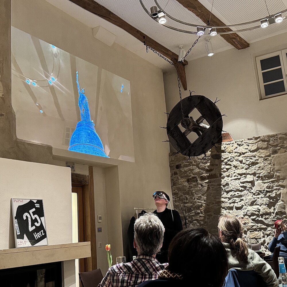 Aber das sollte noch nicht alles sein und die Augen der Gäste wurden immer größer als plötzlich auch noch das Hermannsdenkmal vor ihnen im Raum auftauchte. Hierbei waren die Grenzen zwischen physischer und virtueller Welt kaum noch voneinander zu unterscheiden und eine perfekte Illusion im realen Raum war geschaffen.