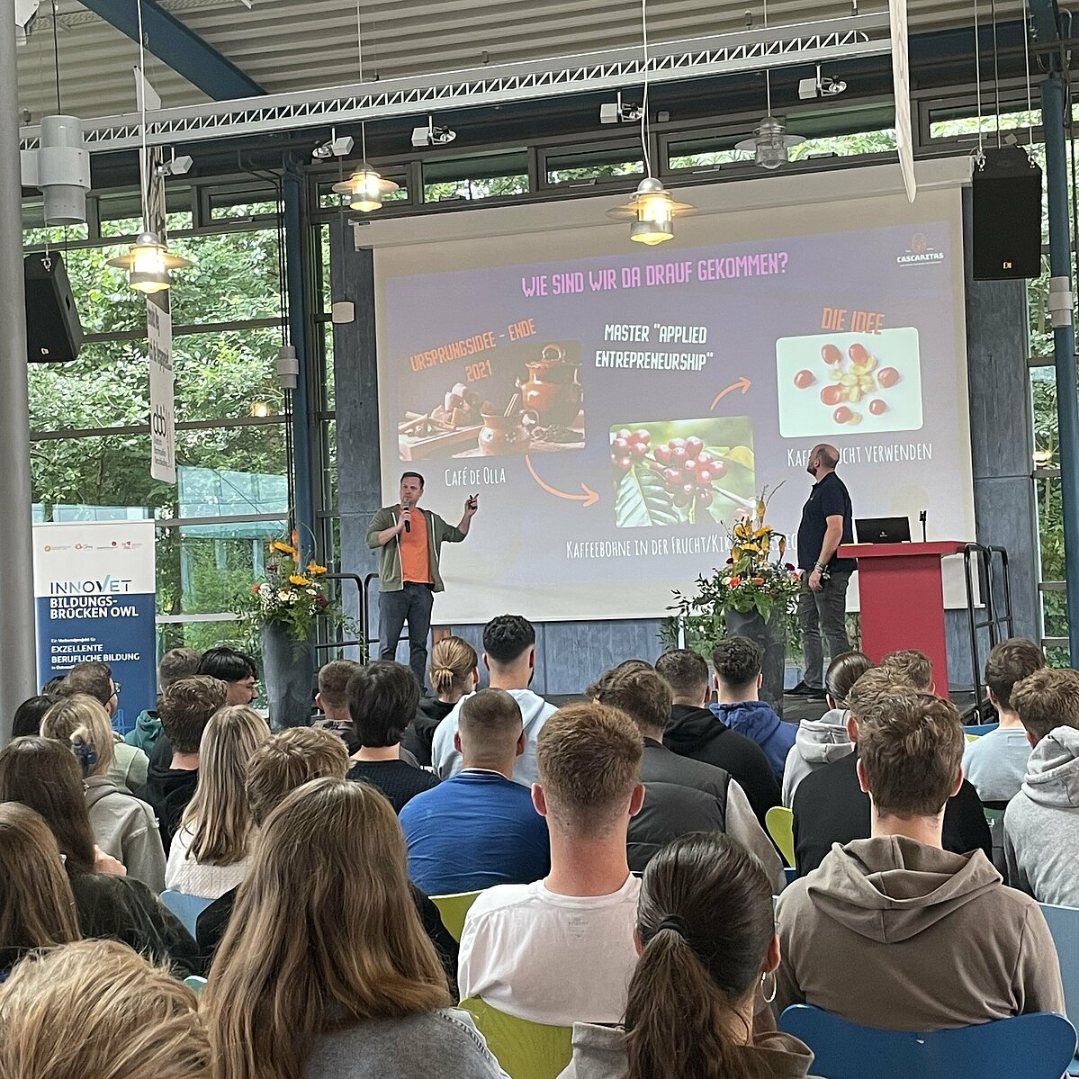 Nach einer kurzen Begrüßung durch Ralf Steltenkamp vom Projekt Bildungsbrücken OWL betraten Kay Schadewald und Daniel Salzburg vom Getränkehersteller Cascaritas als erstes Team die Bühne. Kay erzählte den SchülerInnen, wie er vom Immobilienmakler zum Studium an die TH OWL gekommen ist und anfing, sich mit dem Thema Unternehmensgründung auseinanderzusetzen. Damals habe er gehört, dass die Kaffeekirsche in der EU als neues Lebensmittel zugelassen ist. Diese Frucht gilt sonst nur als Abfallprodukt des Kaffeeanbaus, denn ihr Kern ist die wertvolle Kaffeebohne. Kay hatte die Idee, aus dem fruchtigen und koffeinhaltigen Substrat Tee und Erfrischungsgetränke herzustellen. So entstand Cascaritas. Nach einigen Jahren der Entwicklung wuchs das Team auf 5 Personen an. Daniel, der sich um den Vertrieb kümmert, erzählte den SchülerInnen, wie das Unternehmen versucht seine Produkte in Supermärkten zu platzieren, wie sich der Preis von 1,99€ pro Softgetränk zusammensetzt und welche größeren Ziele das Team verfolgt. Für alle Schüler gab es natürlich eine Verkostung der Carate-Limonade mit Live-Feedback an die Gründer.