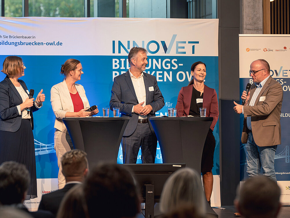 Die rund 100 geladenen Gäste erlebten eine spannende und informative Veranstaltung, die durch die bekannte Radiomoderatorin und gebürtige Lemgoerin Freddy Schürheck begleitet wurde. In der Keynote zeigte Florian Brückner, Oberstudienrat und Projektleiter der Stiftung Bildungspaket Bayern, Perspektiven aus der beruflichen Bildung in Bayern auf. Brückner, extra aus der Transferregion Kronach in Oberfranken angereist, bot zukunftsweisende Einblicke in die realen Herausforderungen des Bildungssystems und stellte praxistaugliche Lösungsansätze vor. Während der anschließenden Podiumsdiskussion erörterten Vertreter der vier Verbundpartner mit Svenja Claes, Projektleiterin der Bildungsbrücken OWL, die Erfahrungen und Erkenntnisse der vier Projektjahre, die Zusammenarbeit der verschiedenen Institutionen sowie den Transfer und die zukünftige Kooperation in der Region. Die Gäste konnten zudem durch eine Posterausstellung Einblicke in die verschiedenen Formate und Themenfelder des Projektes gewinnen und an Thementischen Bedingungen für eine bedarfsgerechte berufliche Bildung diskutieren.