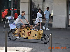 Werden Kinder transportiert, sind sie in der Kiste vorne gut zu beobachten. Lasten sind genauso transportierbar, wenn auch der Platz und die Zuladung begrenzt sind.