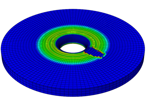 Das Eingangsbild zeigt die FEM-Berechnung eines Umformwerkzeugs zum Zeitpunkt einsetzender Schädigung. Dieses Ergebnis stammt aus der Simulation eines Umformprozesses, bei dem thermische und mechanische Belastungen auf die Umformwerkzeuge und das Werkstück wirken. Für weniger komplexe Fragestellungen ist es hier auch ausreichend ein Achtel-Modell (s.u.) mit entsprechenden Symmetrie-Randbedingungen zu berechnen, um die Rechenzeit zu reduzieren. Auch damit können detaillierte Aussagen über den Umformprozess getroffen werden und Optimierungen am Prozess virtuell durchführt werden.