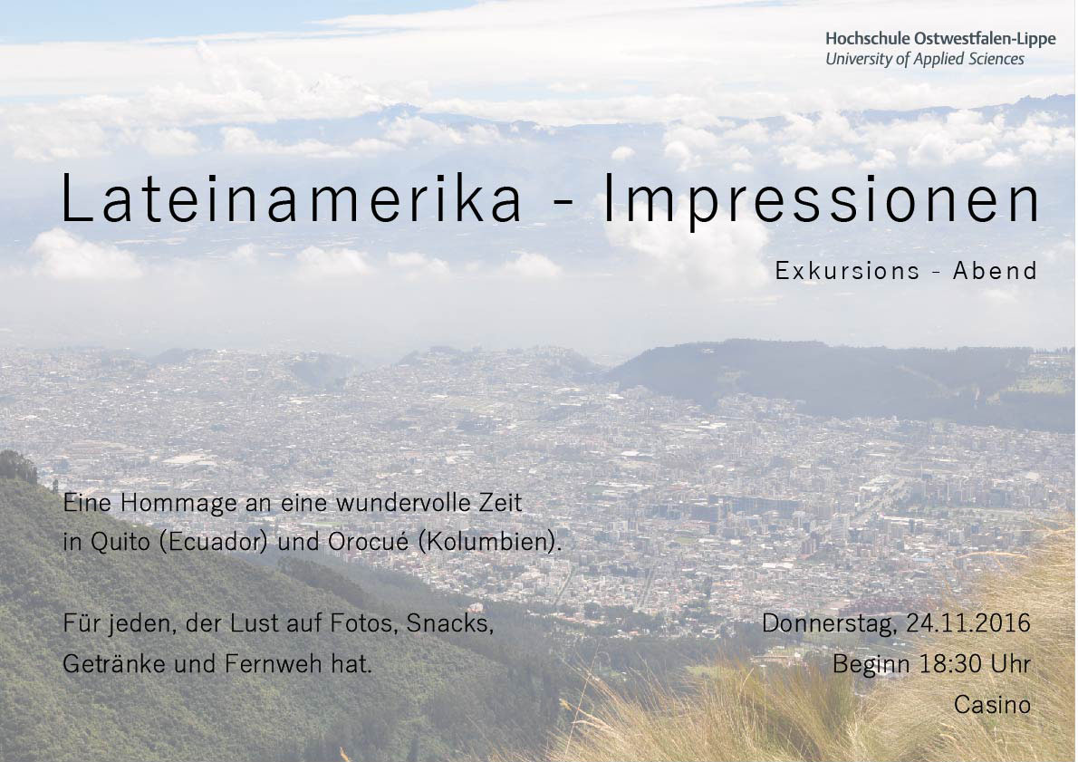 Von den Exkursionen nach Ecuador und Kolumbien berichten Studierende am Donnerstag, den 24. November 2016 ab 18.30 Uhr im Casino. Die Reisen gingen nach Quito und Orocué. Dieser Abend richtet sich laut Prof. Martin Hoelscher auch an diejenigen, die vielleicht nächstes Jahr mit nach Lateinamerika fahren möchten. Neben Fotos wird es auch Snacks und Getränke geben.