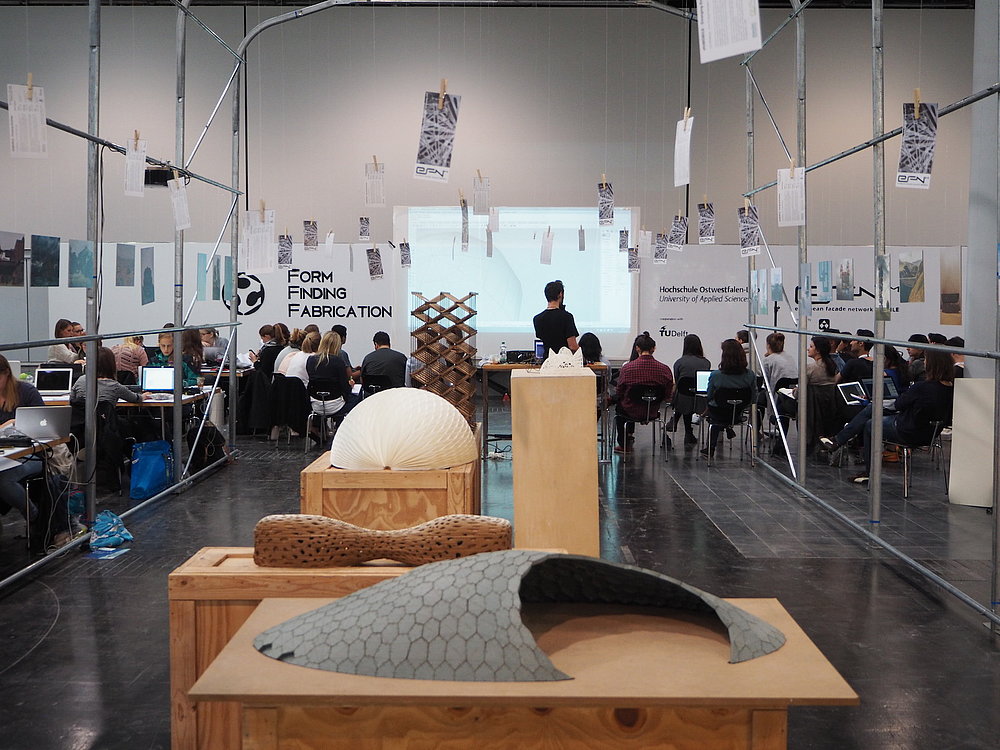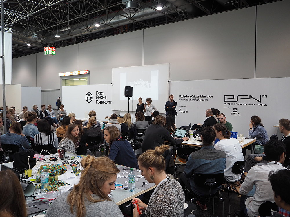 From September 20th to 23rd the European Facade Network (efn) in cooperation with the Detmold School of Architecture and Interior Architecture (HS OWL) and the TU Delft have hosted the workshop 'Form Finding Fabrication' and the Symposium 'Digital Methods' at the glasstec 2016 trade fair in Düsseldorf. Workshop and symposium have been the semester kick-off for Detmold's new master students and have been led by Prof.i.V. Hans Sachs and Dipl.-Ing. David Lemberski.