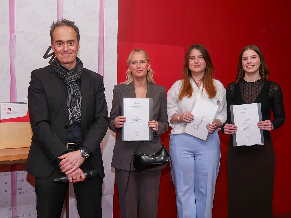 Darüber hinaus wurden landesweit beachtete Preise vergeben. So wurde die Innenarchitektur- Absolventin Carolin Plöger vom Bund Deutscher Innenarchitektinnen und Innenarchitekten NRW (BDIA NRW) für ihre Bachelorarbeit „Volumen Einstellen“ mit dem Preis BDIA ausgezeichnet. Die Absolventin Vanessa Goncz erhielt für ihre Bachelorthesis „T-Lignin Acoustics“ die Anerkennung des BDIA. Ebenfalls anerkannt wurde die Thesis „Form Follows Fun“ von Maren Oscenda. Lucie Moritz-Sosna, Vorstandsvorsitzende des Landesverbands BDIA NRW, Karin Michels, Vorstandsmitglied, und Kristina Herrmann, Beirätin im Vorstand des Landesverbands BDIA NRW, sowie Theresa Kellner, Innenarchitektin und BDIA-Mitglied, gratulierten allen Preisträgerinnen und Preisträgern im Namen des BDIA NRW.
