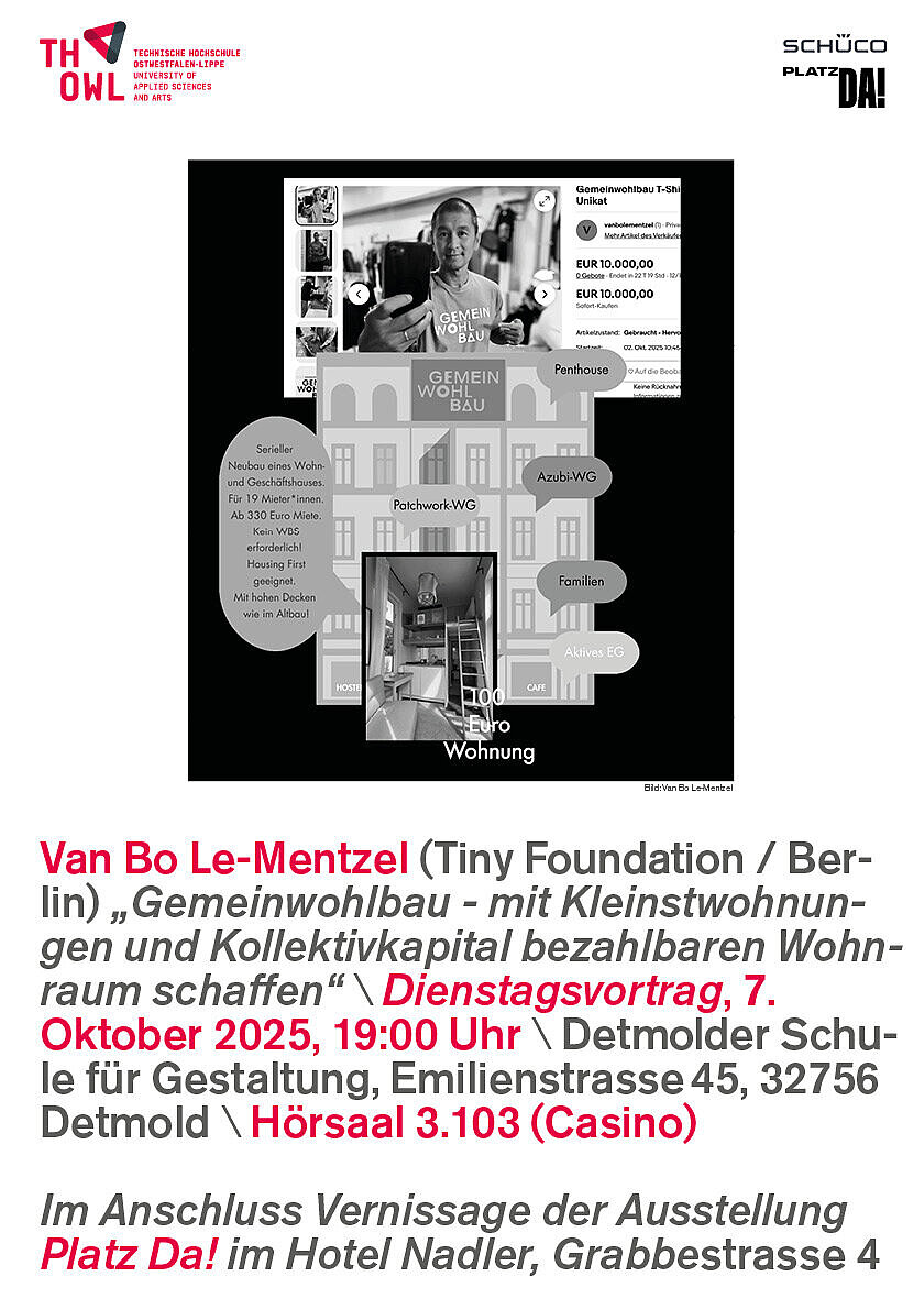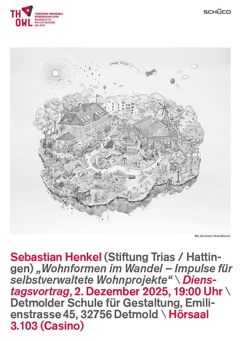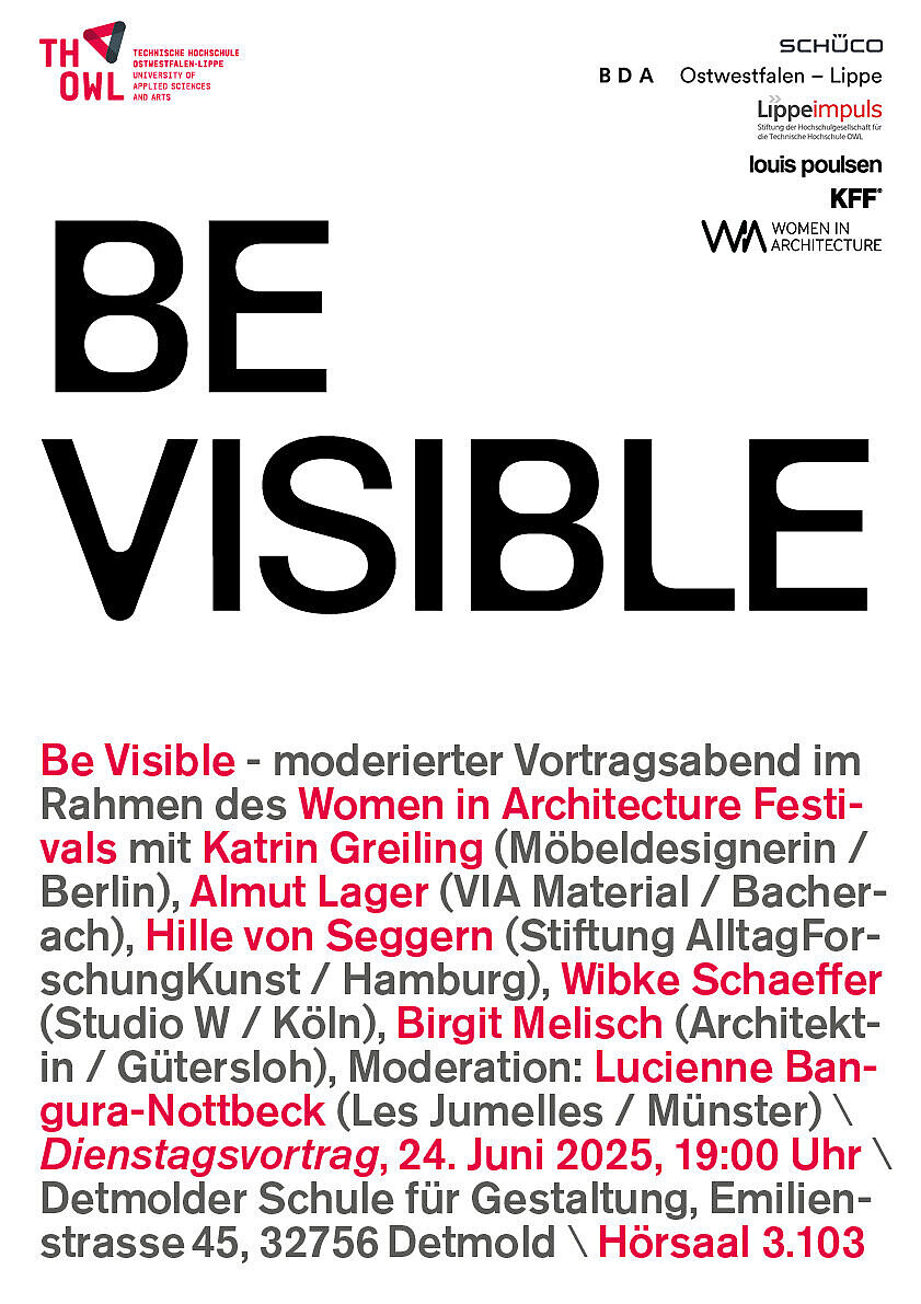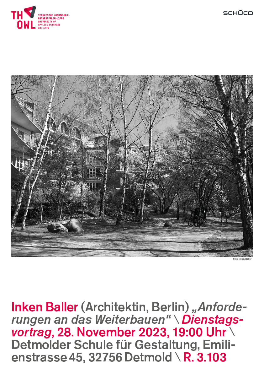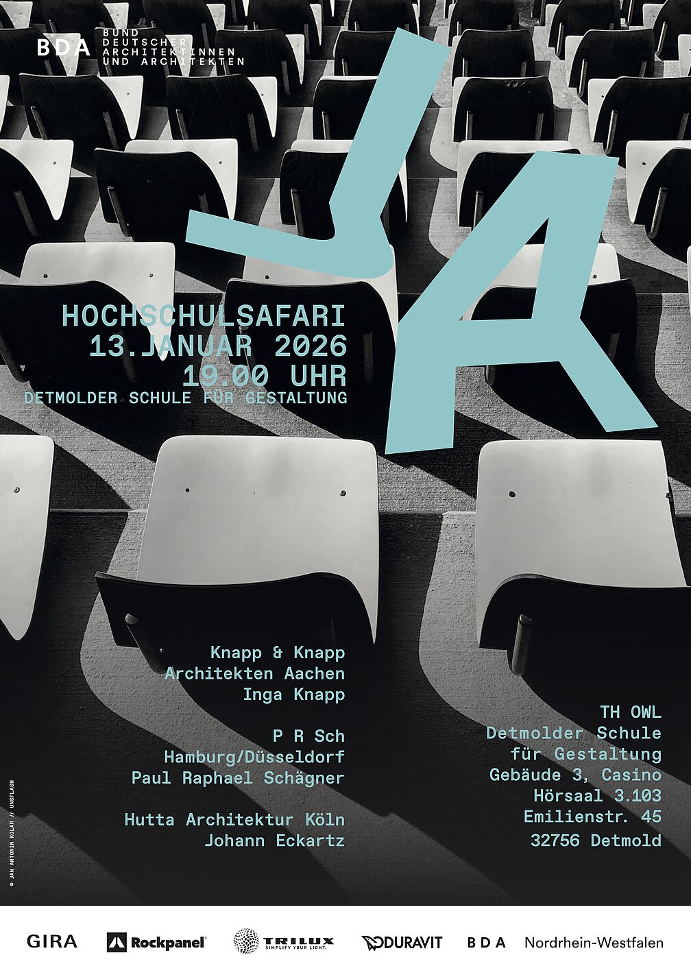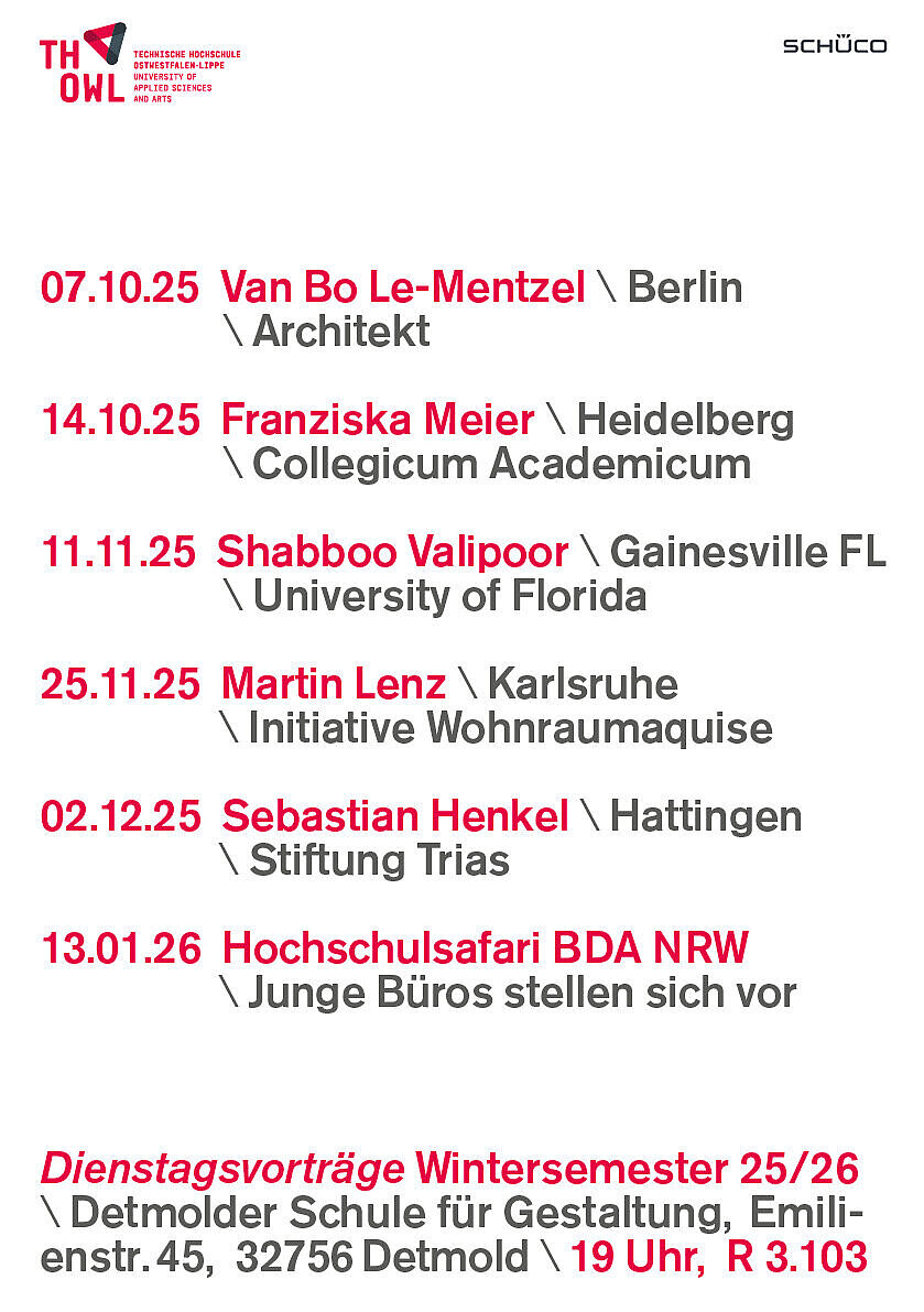 Im Rahmen der Vortragsreihe der Detmolder Schule berichten profilierte externe Referent:innen aus den Bereichen Architektur, Innenarchitektur, Stadtplanung, Theorie und Kunst über ihre Arbeit und das, was sie bewegt und antreibt. Die Vorträge richten sich an alle Hochschulangehörigen sowie die interessierte Öffentlichkeit.