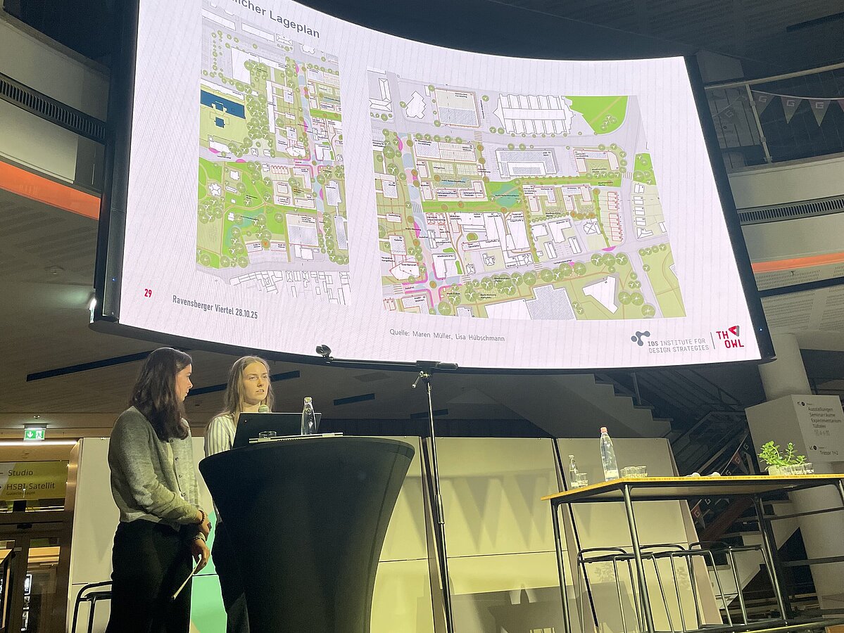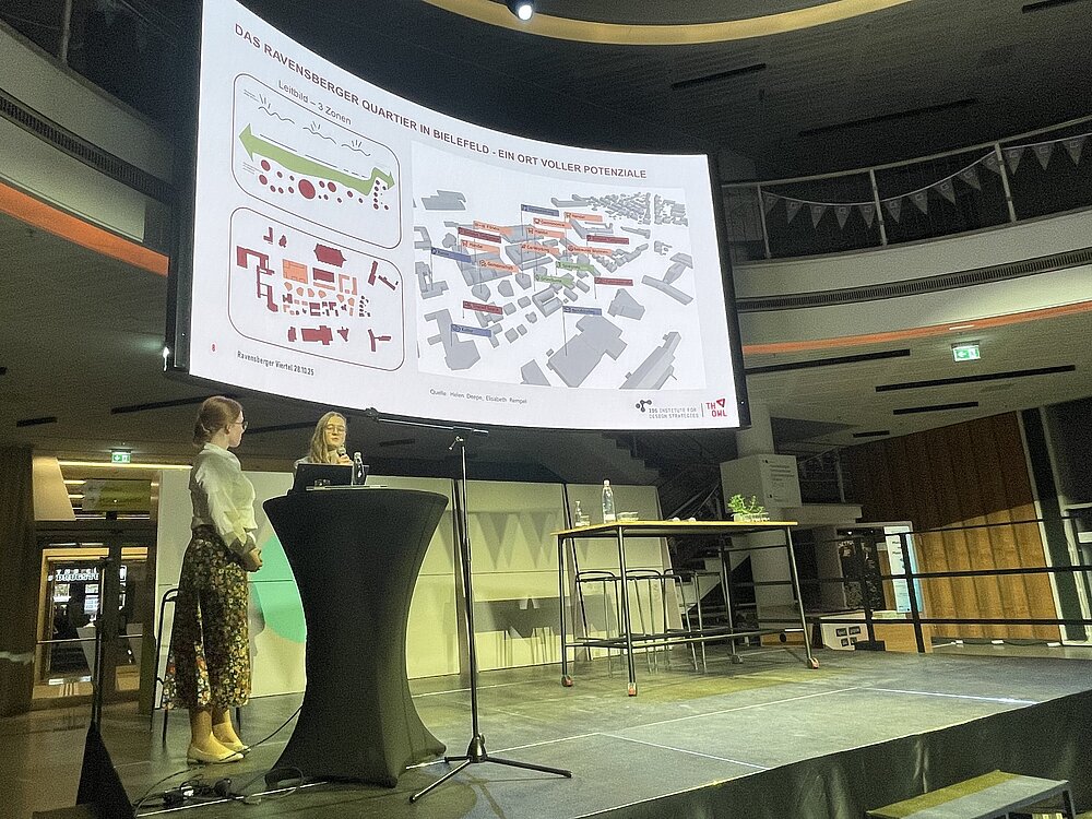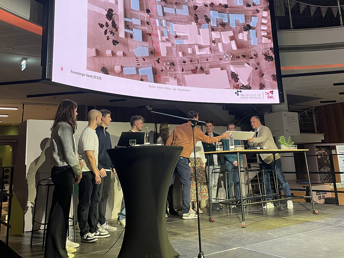Neben der Präsentation der Entwürfe bot das Programm auch inhaltliche Impulse zur aktuellen Stadtentwicklung. Peter Köddermann von Baukultur NRW eröffnete den Abend mit einem Vortrag über die Bedeutung qualitätsvoller Baukultur im urbanen Wandel, gefolgt von einem Gespräch mit Claudia Koch, Dezernentin für Wirtschaft und Stadtentwicklung der Stadt Bielefeld, die die Bedeutung solcher studentischer Projekte für die städtische Planung betonte.