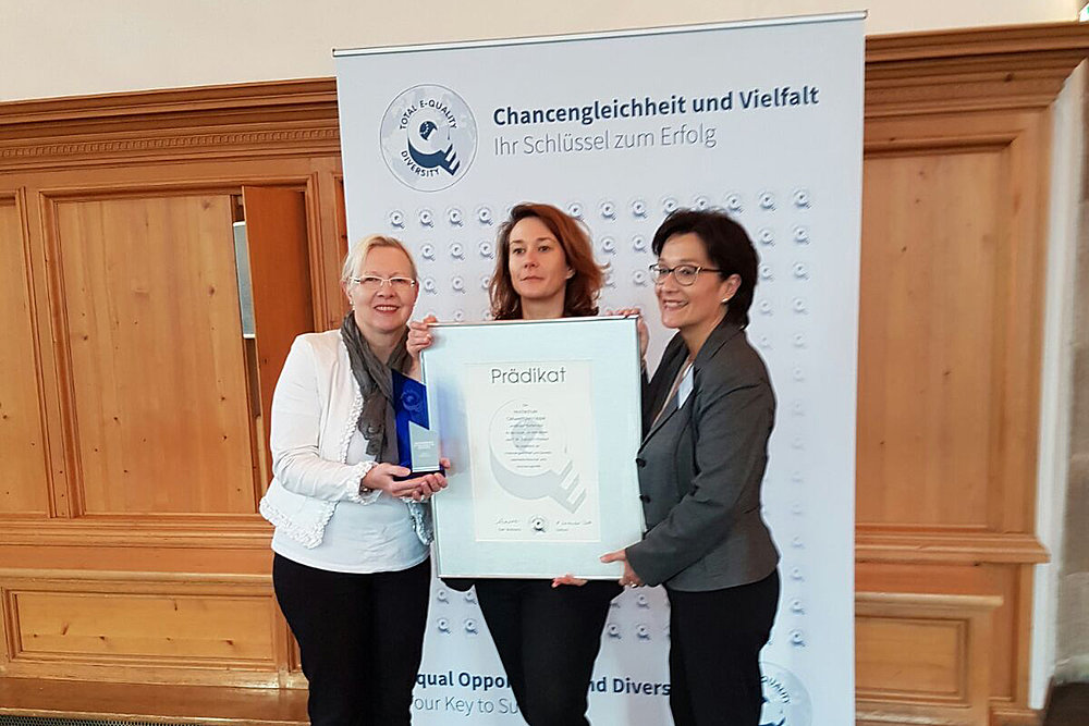 Zum PrädikatTOTAL E-QUALITY steht für Total Quality Management (TQM), ergänzt um die Gender-Komponente (Equality). Organisationen aus Wirtschaft, Wissenschaft und Verwaltung sowie Verbände, die in ihrer Personal- und Organisationspolitik erfolgreich Chancengleichheit umsetzen, werden mit dem Prädikat TOTAL E-QUALITY ausgezeichnet.