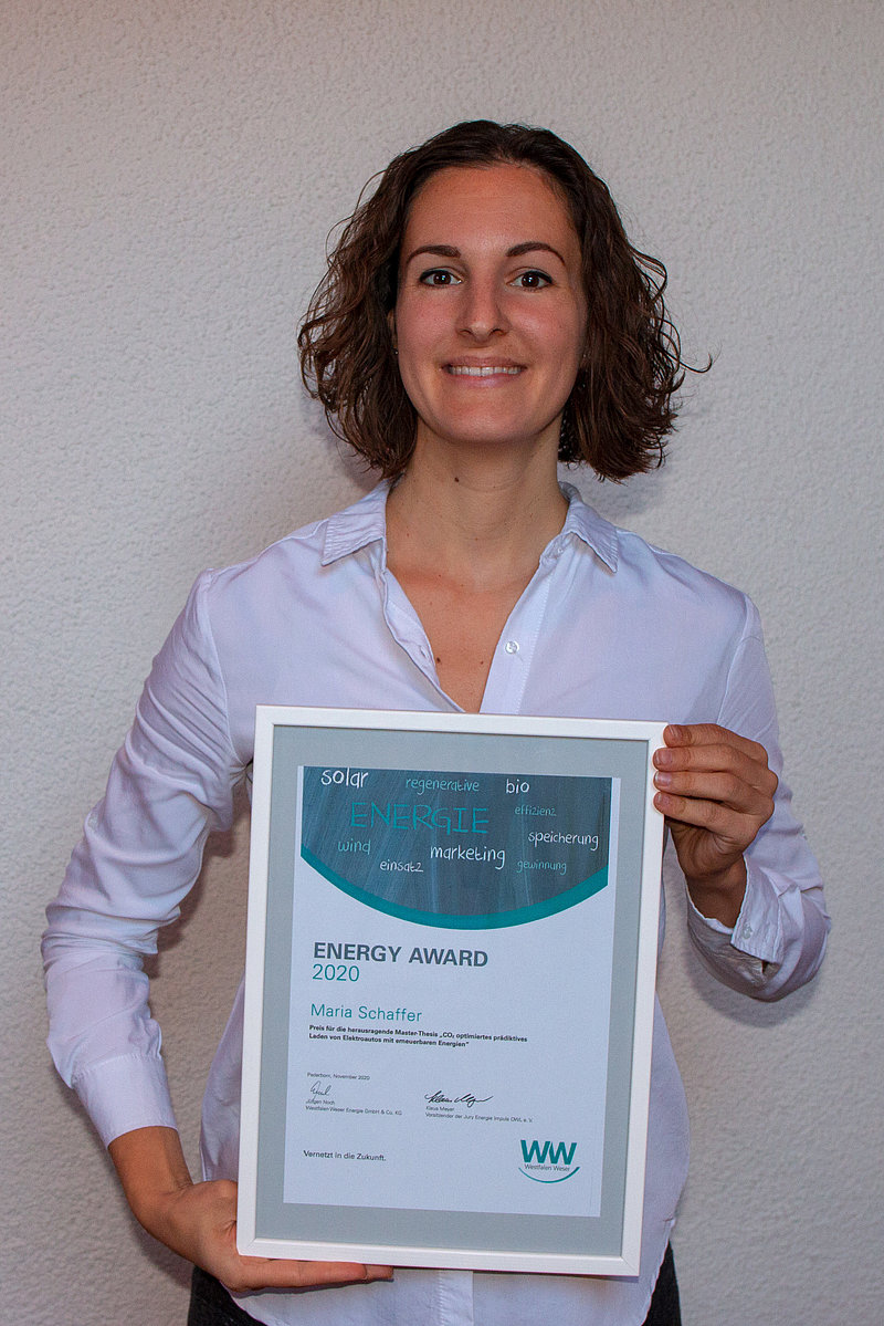 Maria Schaffer, ehemalige wissenschaftliche Mitarbeiterin im Institut für Energieforschung (iFE) der Technischen Hochschule Ostwestfalen-Lippe und Masterabsolventin hat sich beworben und wurde mit dem Energy Award 2020 für die beste Leistung ausgezeichnet. Hintergrund ihrer Bewerbung war ihre Masterarbeit mit dem Titel „CO₂ optimiertes prädiktives Laden von Elektroautos mit erneuerbaren Energien“.