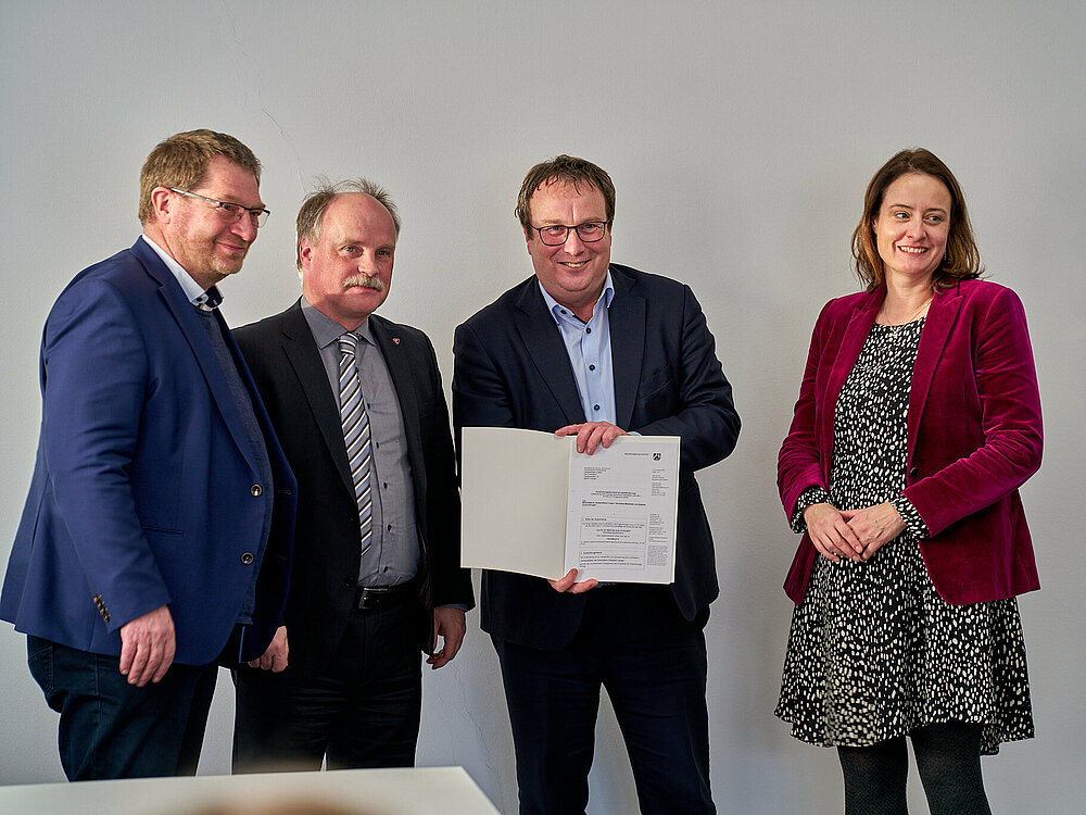 Oliver Krischer, Minister für Umwelt, Naturschutz und Verkehr des Landes Nordrhein-Westfalen, überreichte die Förderzusage des Landes Nordrhein-Westfalen über 780.000 Euro am Mittwoch, 10. Januar, auf dem RailCampus in Minden. Professor Dr. Thomas Schulte, Dekan des Fachbereichs Elektrotechnik und Technische Informatik, sowie Professor Dr. Stefan Witte, Vizepräsident für Forschung und Transfer, nahmen die Papiere dankend entgegen. Die Mittel stammen aus dem EFRE/JTF-Programm Nordrhein-Westfalen 2021-2027.