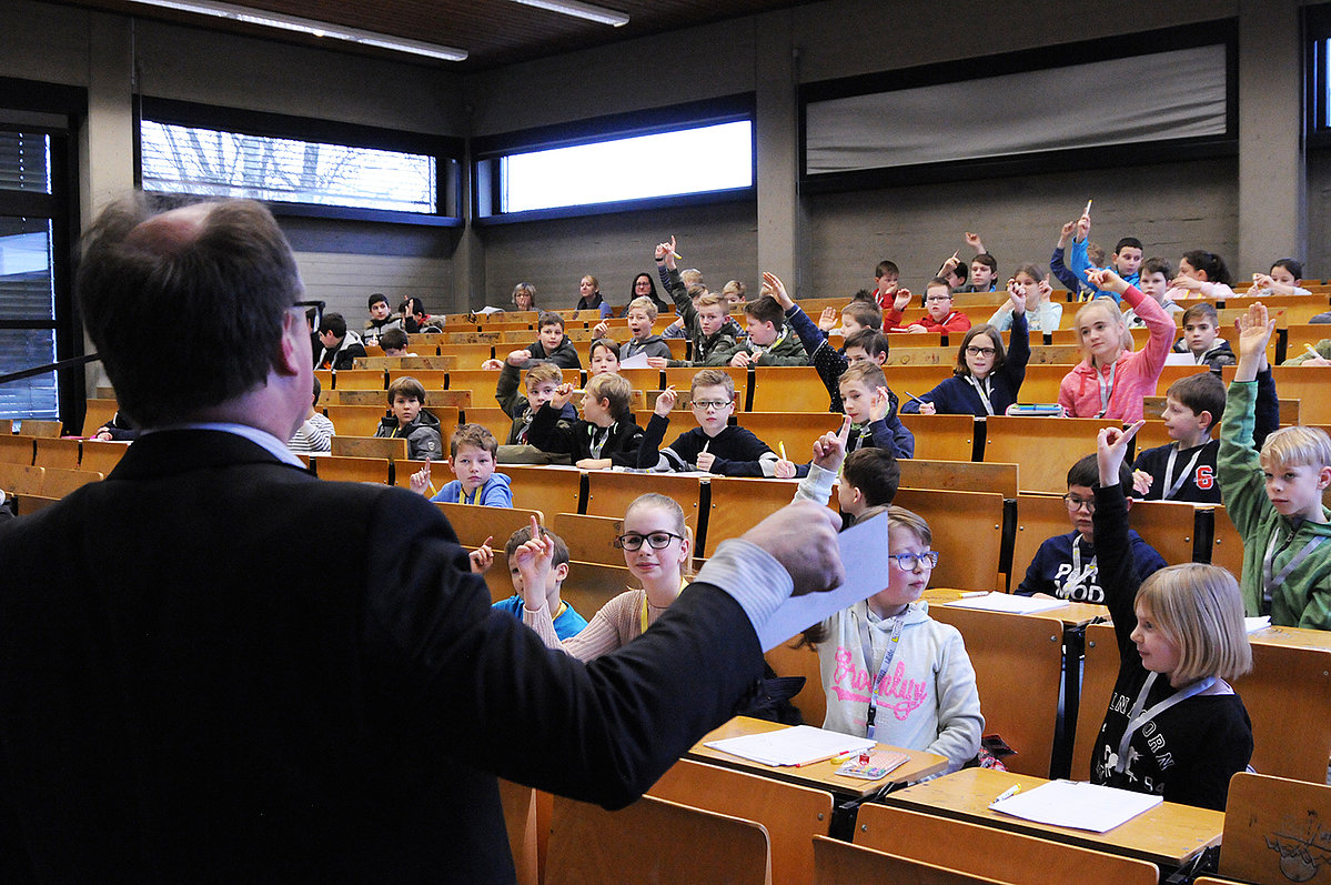 Viele Kinder wussten bereits, dass jedes elektrische Gerät Energie benötigt. Dass auch für die Mobilität, also das Auto- oder Zugfahren, und die Produktion in Firmen oder der Landwirtschaft Energie benötigt wird, war vielen noch nicht so klar. Schulte erklärte den Kindern zusammen mit seinem wissenschaftlichen Mitarbeiter Martin Griese auch, was der Unterschied zwischen Energie und Leistung ist, und dass die Leistung in Kilowatt beziffert wird. Daraufhin sollten die Kinder schätzen, wie viel Strom für verschiedene alltägliche Dinge benötigt wird, wie zum Beispiel das Wasserkochen. Viele Kinder staunten, weil die Nutzung des Smartphones (über den ganzen Tag hinweg) und das einmalige Anstellen des Wasserkochers gleich viel Strom verbrauchen. Noch mehr Raunen ging durch den Hörsaal als Professor Schulte erklärte, wie viel Energie ganz Deutschland im Jahr verbraucht: 2.542 Milliarden Kilowatt – „Wow! Eine Zahl mit neun Nullen“, sagte eines der Kinder laut.