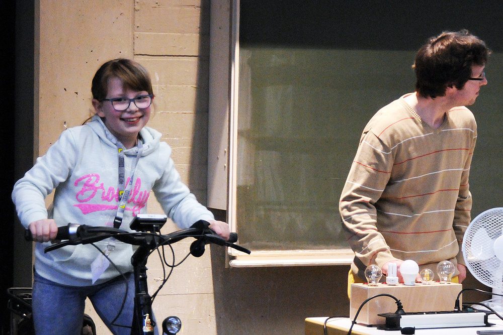 Daraufhin erklärte der Professor, woher wir unsere Energie beziehen und dass bisher nur 13 Prozent aus erneuerbaren Energien, wie Wind, Sonne oder Wasser, stammen. Die größten Lieferanten sind laut Schulte immer noch Mineralöl und Gase. „Das liegt vor allem daran, dass wir enorm viel Energie benötigen“, erklärte Professor Schulte. „Um euch das noch einmal zu verdeutlichen machen wir nun ein Experiment: Wir erzeugen selber Energie mit dem Fahrrad.“ Gesagt, getan: Mehrere Kinder versuchten, eine Glühbirne zum Leuchten zu bringen – und scheiterten. Erst als Martin Griese kräftig in die Pedale trat, leuchtete sogar die 100-Watt-Glühbirne. Ein Nachteil fossiler Energien ist jedoch, dass sie endlich sind und Kohlenstoffdioxid erzeugen, das wiederum für die Klimaerwärmung verantwortlich ist.