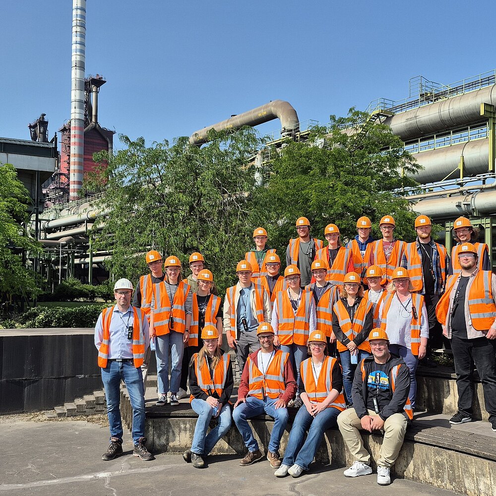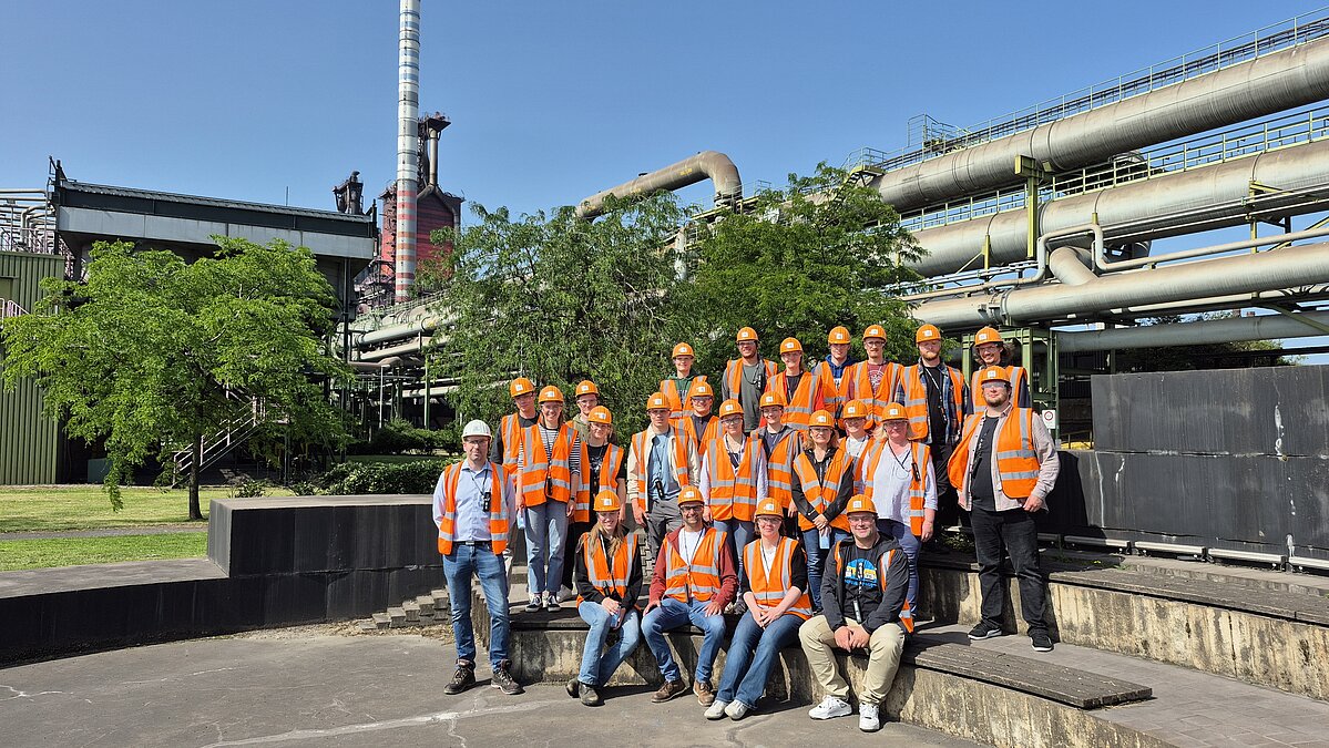 Der letzte Stopp war das Stahlwerk von thyssenkrupp Steel Europe in Duisburg. Bei einer Werksführung haben die Studierenden nicht nur einen Einblick in die heutigen Produktionsprozesse gewonnen, sondern auch viel darüber gelernt, wie Stahl zukünftigt klimafreundlicher hergestellt werden soll.