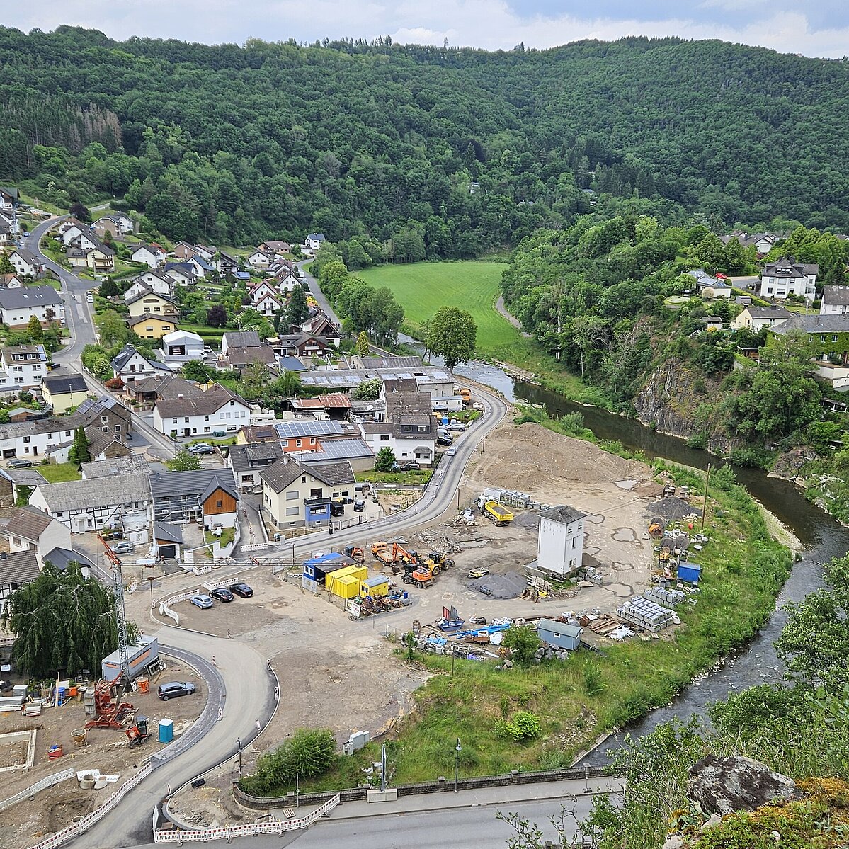Die Exkursion führte zunächst zu mehreren Orten entlang der Ahr. Erste Station war die Gemeinde Schuld, die vom Hochwasser im Juli 2021 besonders stark betroffen war und bis heute mit den Folgen der Katastrophe zu kämpfen hat. Vor Ort berichteten der örtliche Feuerwehrchef sowie betroffene Anwohnerinnen und Anwohner eindrücklich von ihren Erlebnissen in der Flutnacht und den Herausforderungen, die der Wiederaufbau bis heute mit sich bringt.