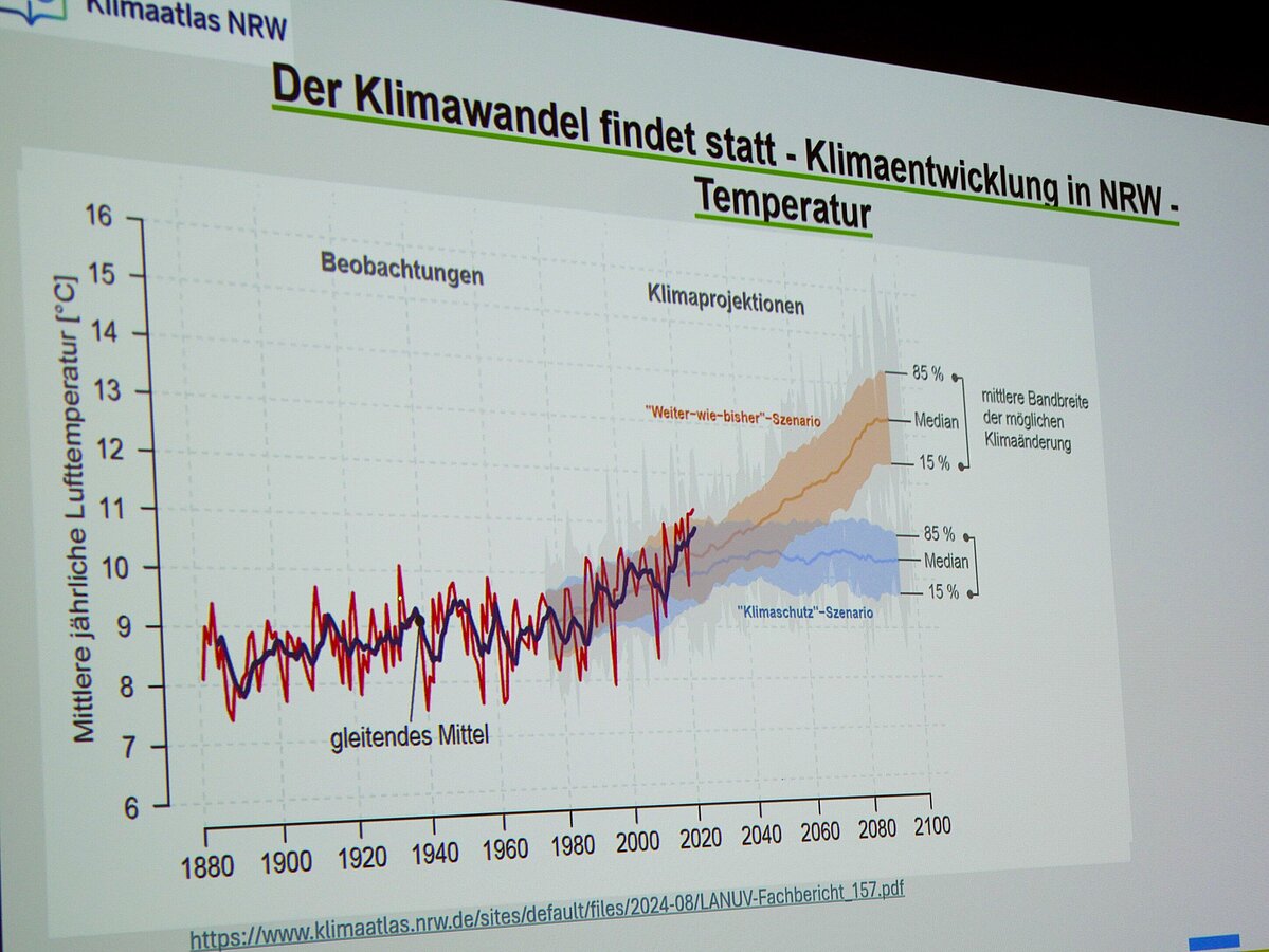 Den Auftakt machte Dr. Tobias Kemper vom Landesamt für Natur, Umwelt und Klima NRW: „Wir haben heute alle relevanten Daten, um Risiken klar zu benennen. Die Frage ist nicht mehr, ob wir handeln müssen, sondern wie schnell wir das gemeinsam tun.“ Er zeigte auf, wie Klimaatlanten, Risikoanalysen und kommunale Monitoring-Instrumente wirkungsvolle Grundlagen schaffen. Wichtig sei es mit gezielten Anpassungsmaßnahmen vor das Ereignis zu kommen und dadurch Schäden und Schadenskosten zu verringern oder zu vermeiden.