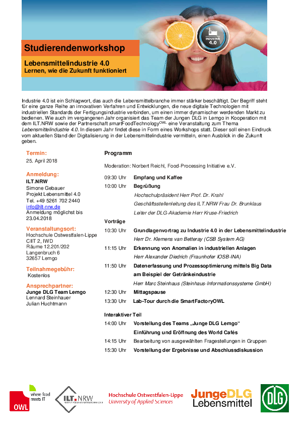 Industrie 4.0 ist ein Schlagwort, das auch die Lebensmittelbranche immer stärker beschäftigt. Der Begriff steht für eine ganze Reihe an innovativen Verfahren und Entwicklungen, die neue digitale Technologien mit industriellen Standards der Fertigungsindustrie verbinden, um einen immer dynamischer werdenden Markt zu bedienen. Wie auch im vergangenen Jahr organisiert das Team der Jungen DLG der Hochschule in Kooperation mit dem ILT.NRW sowie der PartnerschaftsmartFoodTechnologyOWL eine Veranstaltung zum Thema “Lebensmittelindustrie 4.0“. In diesem Jahr findet diese in Form eines Workshops am 25.04.2018von 9:30 bis 15:30 Uhr in den IWD-Räumen im CIIT 2 an der Hochschule OWL statt. Dieser soll einen Eindruck vom aktuellen Stand der Digitalisierung in der Lebensmittelindustrie vermitteln und einen Ausblick in die Zukunft geben.