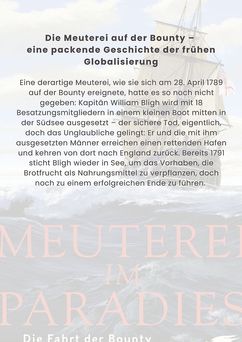 Mitreißend schildert Simon Füchtenschnieder die Seefahrt der Bounty, die Meuterei an Bord und das Schicksal der Besatzungsmitglieder. Erstmals bettet er diesen sagenhaften Stoff diverser Abenteuergeschichten in den seefahrthistorischen und wirtschaftlichen Kontext seiner Zeit ein und zeigt: Die Geschichte der Bounty war kein isoliertes Ereignis, sondern Wegbereiter einer frühen Globalisierung, die unsere Welt bis heute prägt.