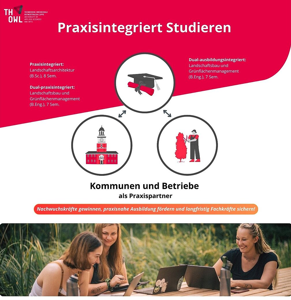 Während des s dual-praxisintegrierten Studiengangs Landschaftsbau und Grünflächenmanagement sind die Studierenden bereits bei einer Kooperationsstelle beschäftigt und arbeiten dort während der vorlesungsfreien Zeit und im Praxissemester (5. Semester). Dies ermöglicht oft einen gesicherten Einstieg in das Berufsleben. Ihre Abschlussarbeit schreiben die Studierenden in der Regel über eine Aufgabenstellung aus ihrer beruflichen Praxis, so erhält die Kommune mit den Absolvent:innen bereits eingearbeitete Mitarbeiter:innen, die sofort vollwertig einsetzbar sind.