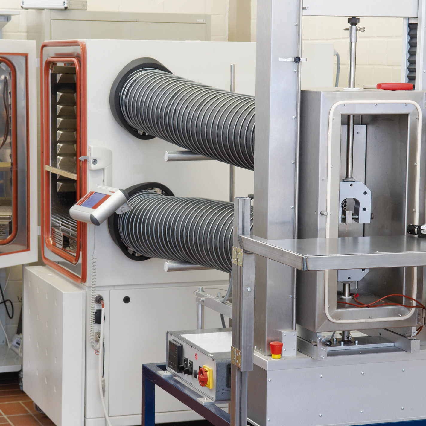 - Zugprüfmaschine für Ermittlung von Betätigungskräften und der elektrischen Widerstand-Kontaktkraft-Kennlinien unter Temperatureinfluss sowie Temperatureinflüssen auf mechanische Eigenschaften von Werkstoffen (-40°C bis 150°C)
