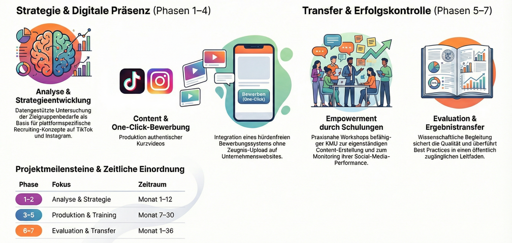 In der längsten Projektphase setzen wir die entwickelten Strategien in die Praxis um. Gemeinsam mit den KMU werden authentische Inhalte wie Videos und Beiträge erstellt, auf den relevanten Plattformen veröffentlicht und ihre Wirkung kontinuierlich getestet und optimiert. - Phase 4: Entwicklung eines One-Click-Bewerbungssystems (Dauer: 9 Monate)