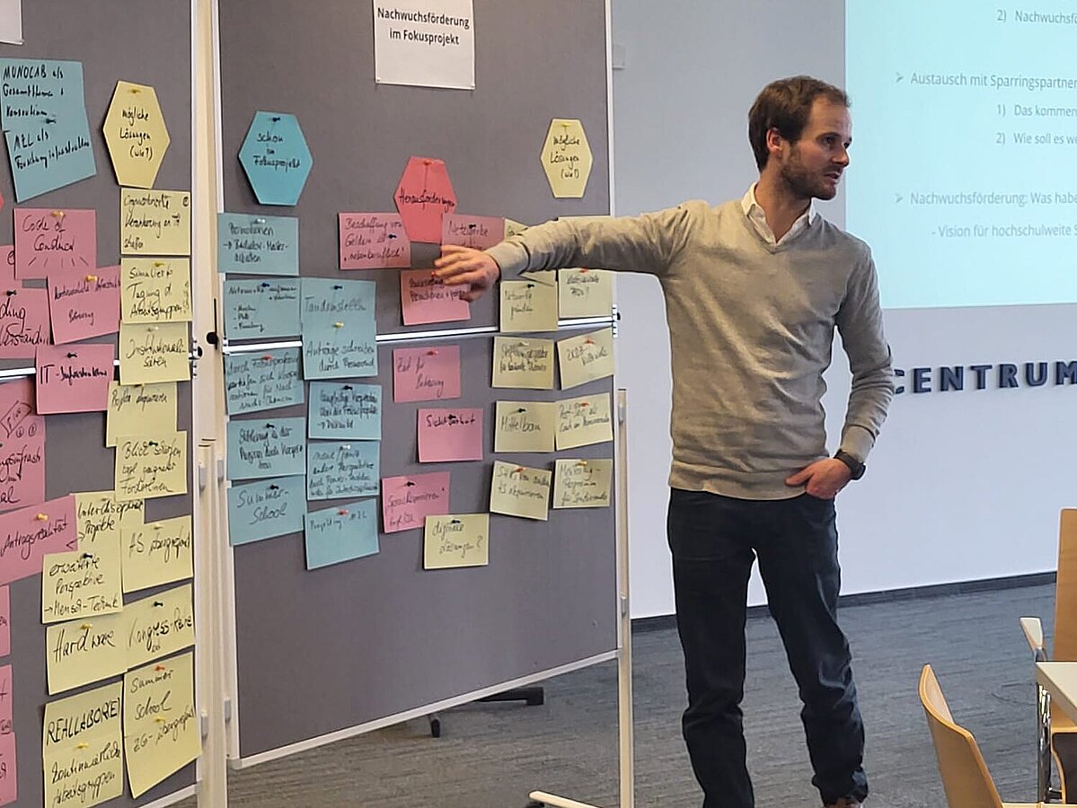 Der intensive Austausch fand, wie in den vorangegangenen Treffen, nicht nur am runden Tisch, sondern auch in Kleingruppen statt. Interaktive Formate und konkrete Fragestellungen förderten dabei die Diskussion. Zudem hatte jede:r Fokusprofessor:in im Vorfeld ein Projektposter erarbeitet, das Einblicke in den aktuellen Stand der Vorhaben sowie erste Anknüpfungspunkte zu den Fokusthemen Nachhaltige Strukturen und Nachwuchsförderung bot.