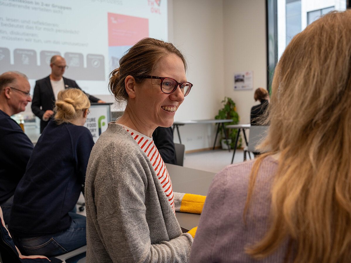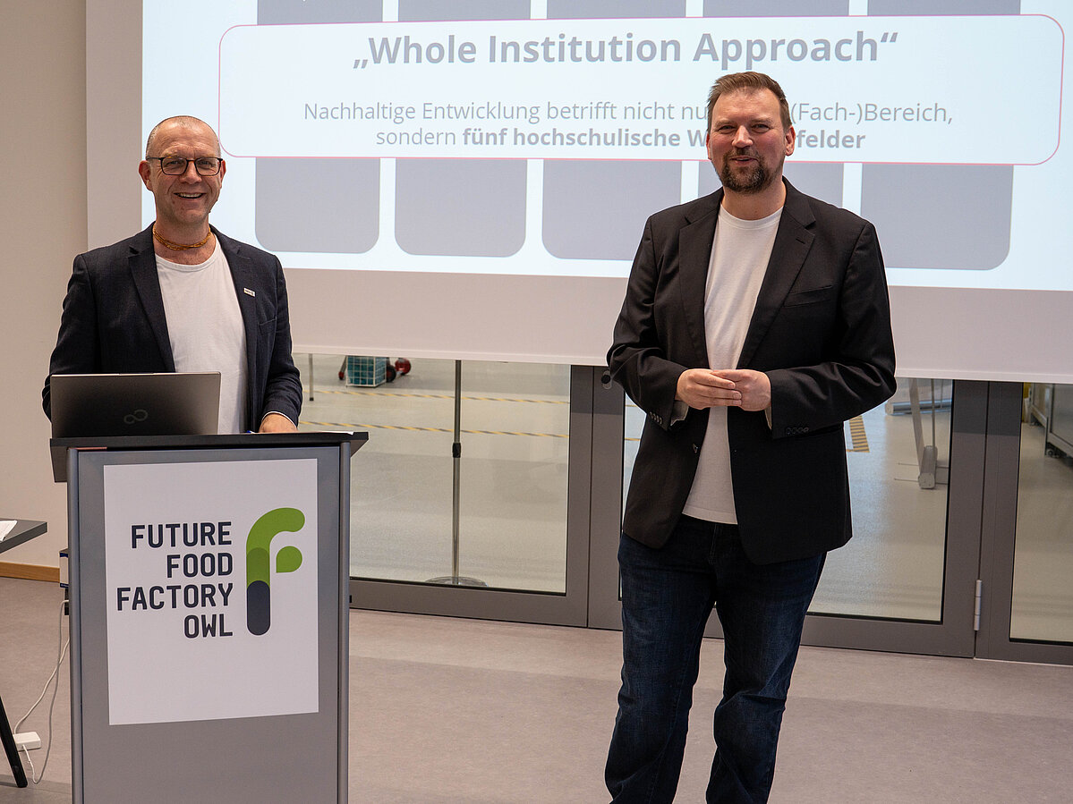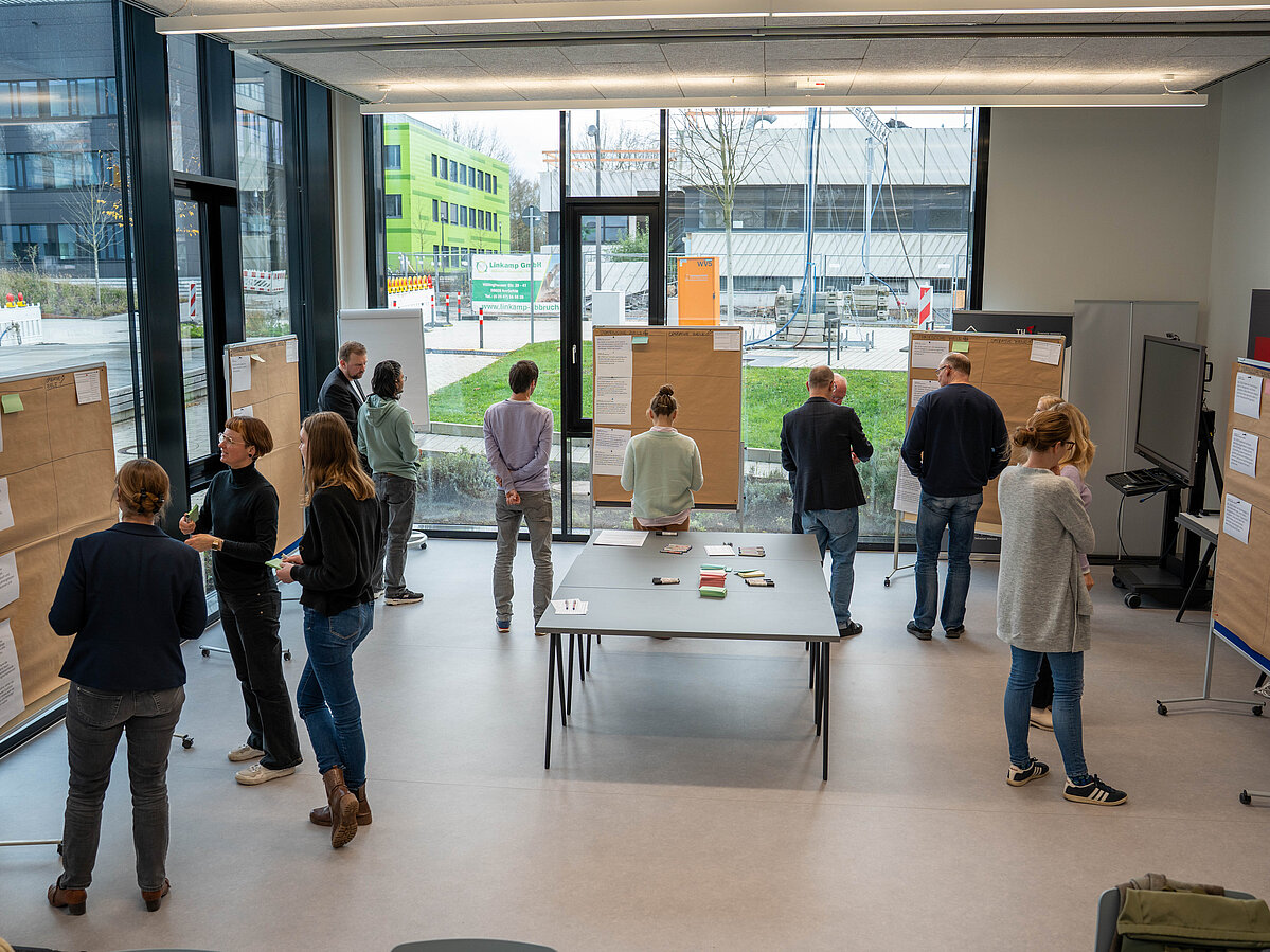 Die Nachhaltigkeitsmanager Christian Einsiedel und Dr. Christoph Harrach führten im Foyer der Future Food Factory OWL in die Thematik ein. In der ersten Workshop-Runde ging es um offenen Austausch: Die Teilnehmenden konnten ihre Einschätzungen teilen, kritische Fragen stellen und über die bisherigen Ansätze diskutieren. In der zweiten Runde wurden konkrete Vorschläge gesammelt, welche und operativen Zwischenziele sich die TH OWL bis 2030 setzen sollte. Zudem gab es Raum für kritisch-konstruktives Feedback zu den bereits erarbeiteten Strategieentwürfen.