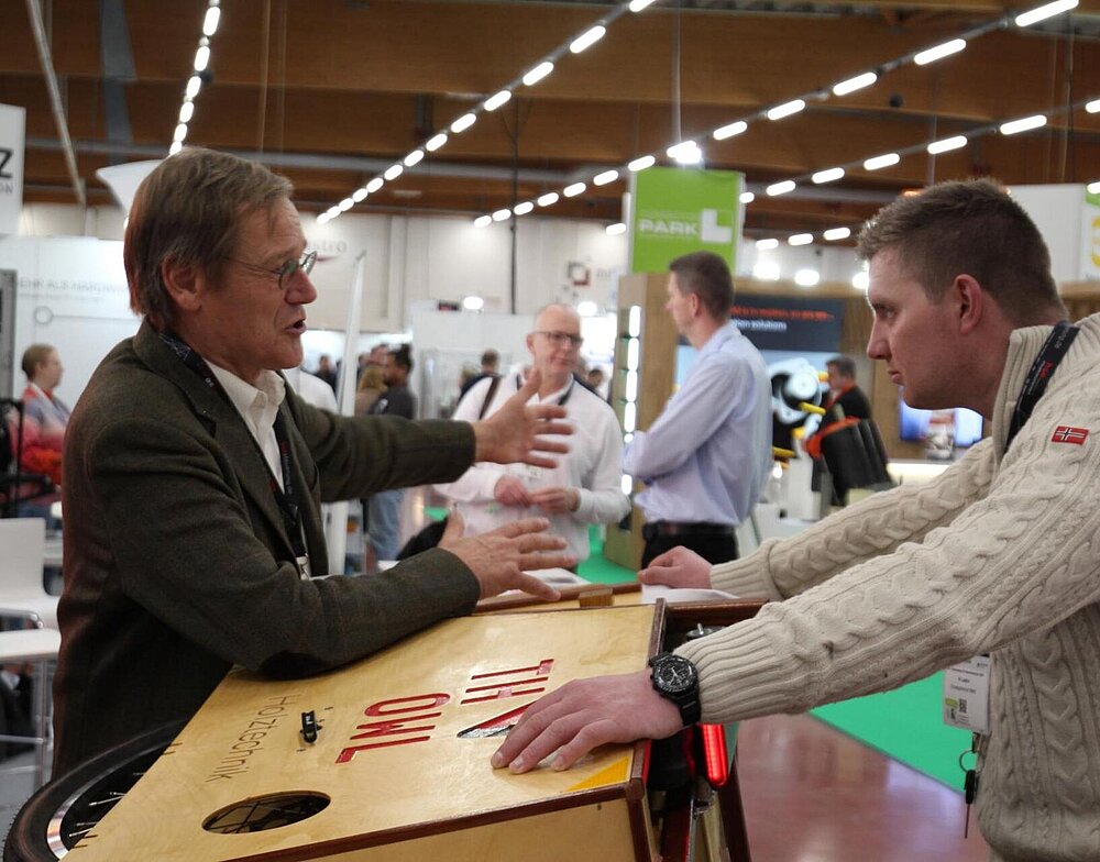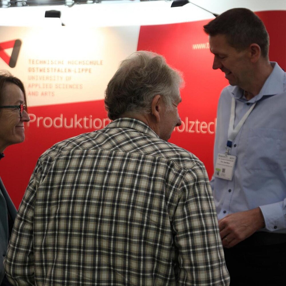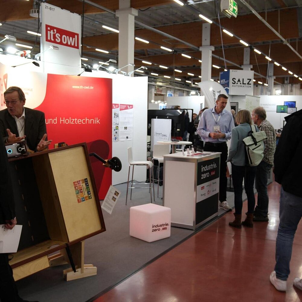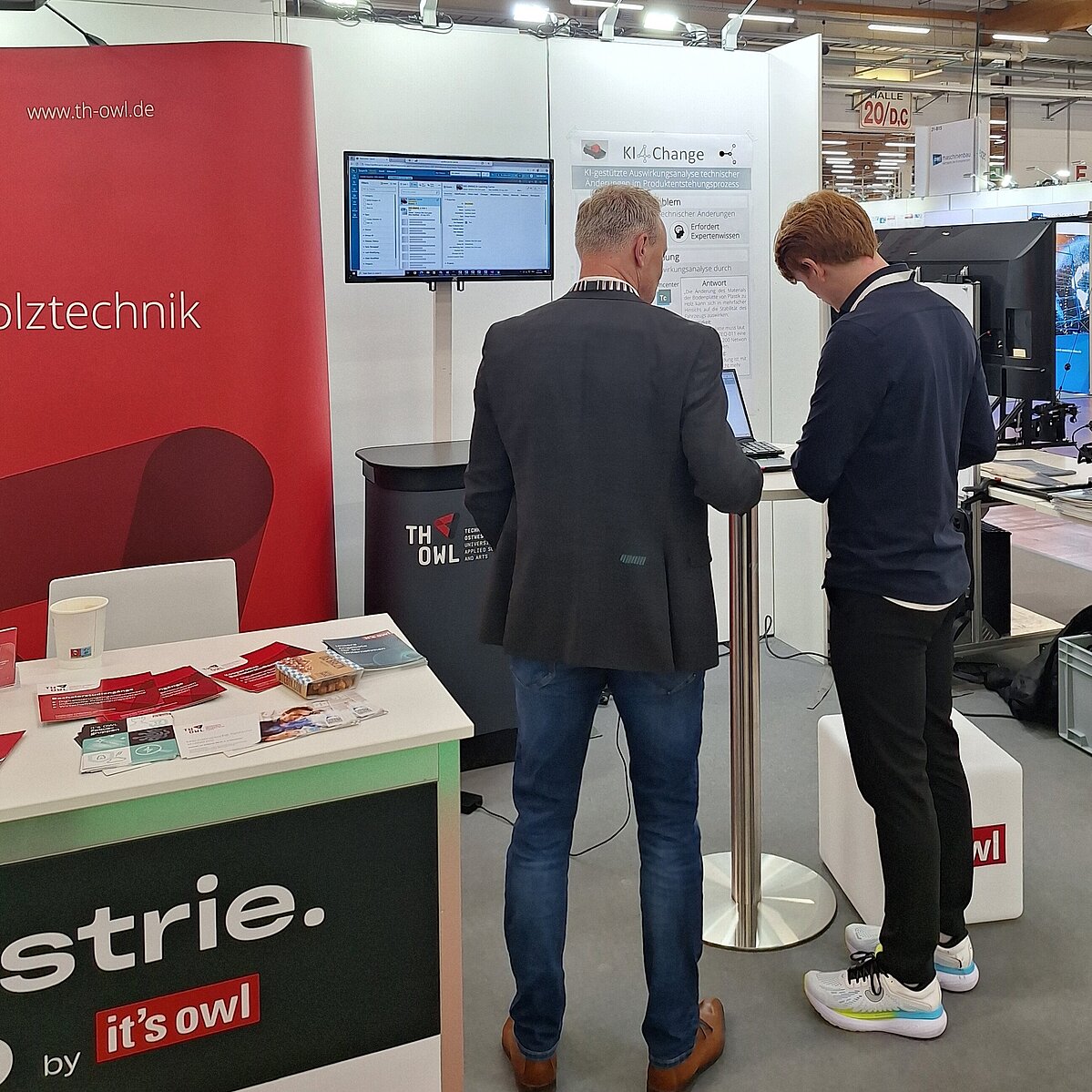 Nachhaltige Mobilität und Bauteilprüfung: Die TH OWL verband gleich zwei Ansätze in einem Demonstrator. Gezeigt wurde ein elektrisch angetriebener Fahrradanhänger aus Holz mit Auflaufbremse, der nachhaltige Mobilität mit moderner Technik verbindet. Ergänzt wird dies durch eine Schadensanalyse, die anhand realer beschädigter Bauteile zeigt, wie sich Materialfehler frühzeitig erkennen lassen. Der Demonstrator verdeutlicht, wie praxisnah die TH OWL forscht und lehrt: Neben der Entwicklung neuer Konzepte für klimafreundliche Mobilität werden gleichzeitig Technologien für eine zuverlässige Qualitätskontrolle in der Industrie vorangetrieben. Für mittelständische Unternehmen sind das Impulse, wie sich Nachhaltigkeit und Effizienz gleichermaßen in Produkte und Prozesse integrieren lassen. Am Donnerstag wurde zudem ein Prototyp zur Unterstützung der Auswirkungsanalyse technischer Änderungen im Produktentstehungsprozess vorgestellt, der im Rahmen eines von Siemens geförderten Forschungsprojekts entwickelt wurde. In verschiedenen Gesprächen und Diskussionen mit Ingenieur:innen und weiteren Akteur:innen aus der Industrie konnten wertvolle Erkenntnisse über die praktischen Potenziale des Prototypen sowie über Einsatz- und Weiterentwicklungsmöglichkeiten gewonnen werden.