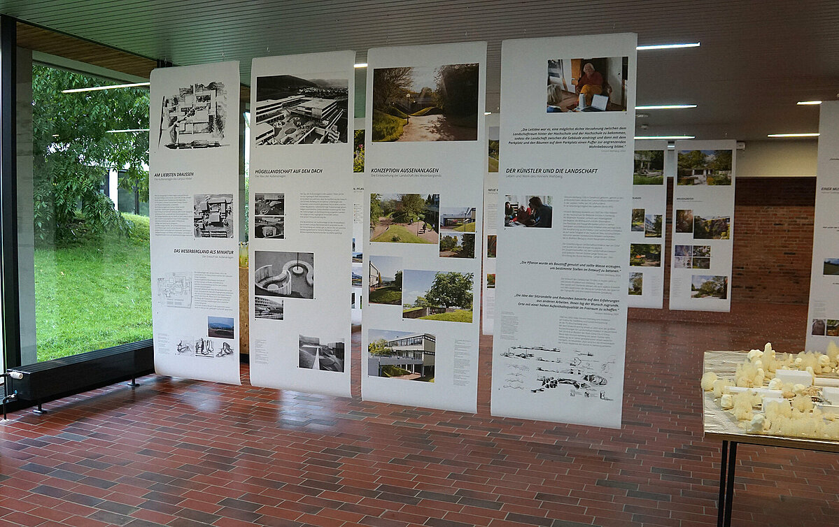 Die Ausstellung ist in mehrere Schwerpunkte gegliedert, die von den Studierenden in Gruppenarbeit erstellt wurden. Ein Team widmete sich den alten und aktuellen Bauplänen der Hochschule, ein weiteres setzte den Campus fotografisch in Szene. Unter der Anleitung von Claudia Dreyße entstanden dabei außergewöhnliche Aufnahmen, die neue Blickwinkel auf den Campus ermöglichen. Eine dritte Gruppe verfasste die begleitenden Texte zu den Exponaten, die die Betrachter:innen auf eine Zeitreise vom Planungsstart 1962 bis in die Gegenwart mitnehmen.
