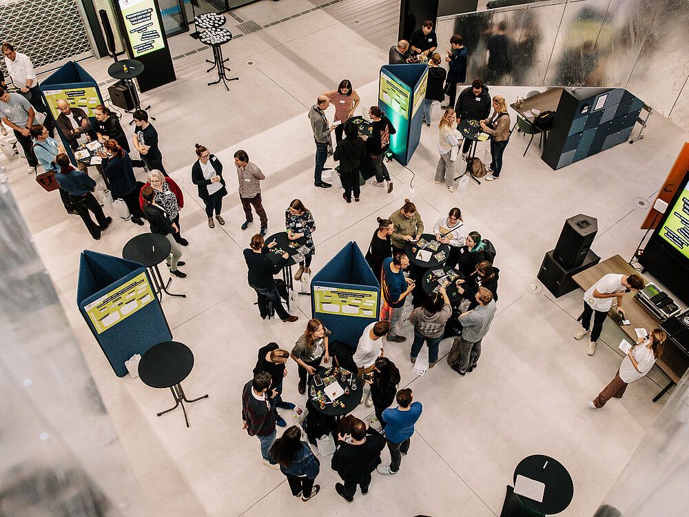 Nach einer gemeinsamen Einstimmung im Audimax wurde die Veranstaltung im InnovationSPIN auf dem Campus in Lemgo fortgesetzt: Dort trafen sich die Projektgruppen mit ihren Betreuenden sowie Praxispartner:innen und Ideengeber:innen. Mithilfe von der Methode LEGO® Serious Play®, die Teams bei Problemlösung unterstützt und Kommunikation wie Kreativität fördert, wurden die Erwartungen an die gemeinsame Projektarbeit sichtbar gemacht. Die bunten Bausteine erweisen sich als erstaunlich hilfreich, wenn unterschiedliche Disziplinen gemeinsam an Fragestellungen arbeiten – beim intuitiven Basteln entstehen fast automatisch neue Perspektiven und Potenziale.