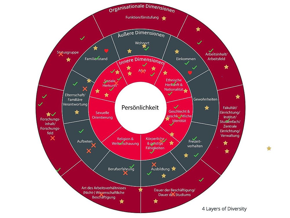 Die Grafik veranschaulicht, wie vielfältig der Begriff Diversität verstanden wird. Um ferner zu verdeutlichen, wie komplex die Situation ist, wurden die „4 Layers of Diversity“ im Hochschulkontext gezeigt. In dieser Grafik sollten sich die Teilnehmenden durch Platzieren eines Stempels verorten.