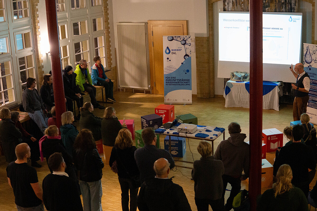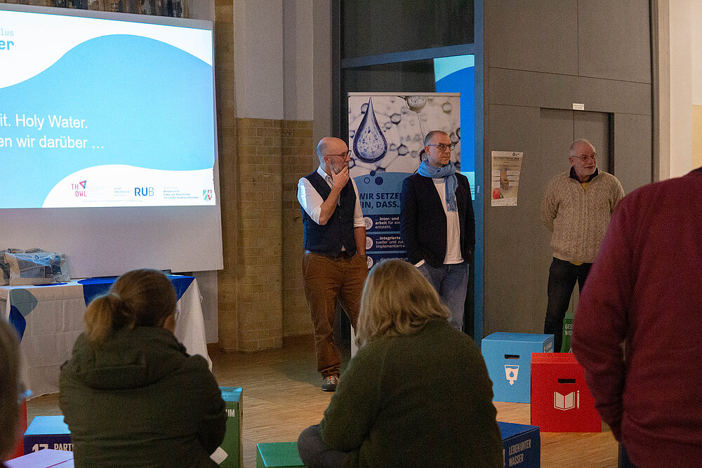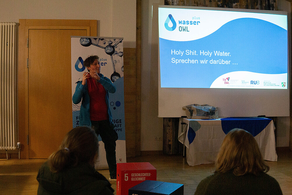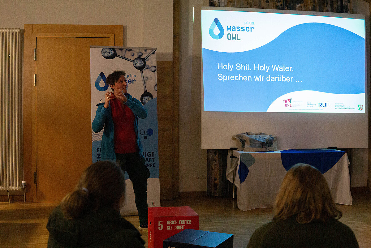 Im Anschluss an die Filmvorführung präsentierte Stefanie Gebhardt, Vertreterin des deutschen Start-ups Finizio, das ebenfalls im Film porträtiert wird, innovative Ansätze zur Trockentrenntechnologie und zur hygienischen Rückgewinnung von Nährstoffen. Parallel dazu diskutierten Prof. Dr.-Ing. Jörg Felmeden (Verbundleiter wasser^plus OWL und Fachgebietsleiter Siedlungswasserwirtschaft, TH OWL), Prof. Dr.-Ing. Martin Oldenburg (Fachgebiet Biologische Abwasserreinigung und Abwasserverwertung, TH OWL, sowie Verbundmitglied wasser^plus OWL) und Dr. Christoph Harrach (Nachhaltigkeitsmanagement, TH OWL) mit den Teilnehmenden über eine „Solidarische Nährstoffwirtschaft“ und mögliche Umsetzungsschritte auf dem Campus Detmold.