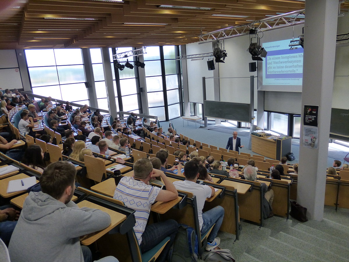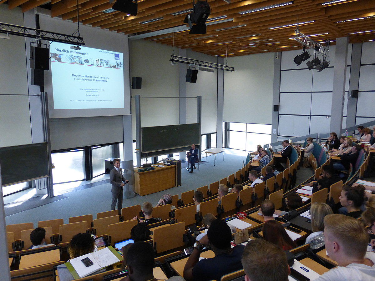 Welchen Herausforderungen wird eine angehende Führungskraft mit hoher Wahrscheinlichkeit in seiner späteren Karriere begegnen? Welche Anforderungen ergeben sich hieraus an dessen Kompetenzen? Um dieses und weitere angrenzende Themen ging es bei einem Gastvortrag im Fachbereich „Produktion und Wirtschaft“ an der Hochschule OWL vor ca. 200 interessierten Zuhörern. Unter dem Motto „Praktiker vor Ort“ berichtete Prof. Dr. Dieter Dresselhaus aus seiner fast drei Jahrzehnte umfassenden Erfahrung als geschäftsführender Gesellschafter der Holter Regelarmaturen GmbH & Co. KG (HORA).