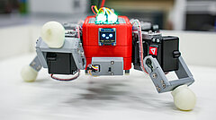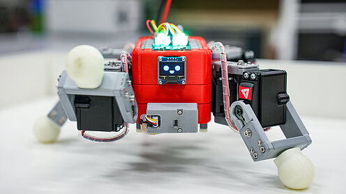 Lerne den JoBot kennen – einen ca. 40 cm großen, vierbeinigen Showroboter, der läuft, winkt und sogar Liegestützen oder Schwimmbewegungen macht! Du kannst ihn einfach beobachten oder auch selbst aktiv werden: Steige in die Programmierung ein und bringe das Bein des JoBots in Bewegung. Der JoBot war bereits auf Messen wie myJobOWL und beim Tag der offenen Tür der TH OWL zu sehen.