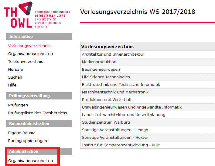 Unter dem Menüpunkt "Organisationseinheiten und Adressen" im CAS Campus sind die Organisationseinheiten der TH OWL dargestellt.