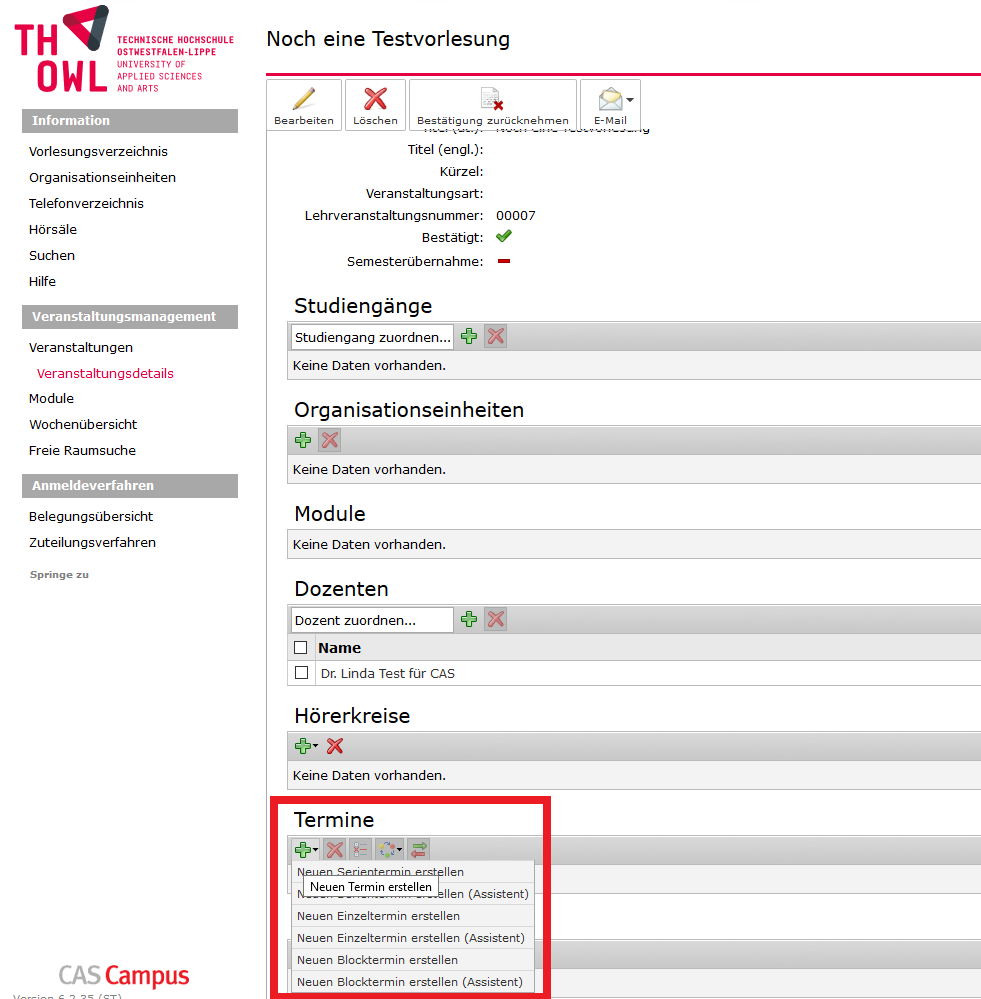 Die Termin- und Raumbuchungen können im CAS Campus nur von den Stunden- und Prüfungsplanern vorgenommen werden. Die Bediensteten der TH OWL können Terminwünsche oder Änderungsanfragen zu den Veranstaltungen die Sie bearbeiten äußern. Eine Anleitung hierzu finden Sie im Abschnitt "Terminwünsche".