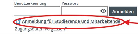 Studierende und Mitarbeitende klicken bitte auf "Anmeldung für Studierende und Mitarbeitende". Bitte nutzen Sie nicht die Felder "Benutzerkennung und Passwort".