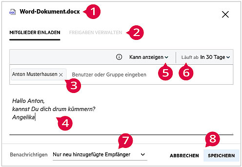 - Nachricht: Hier können Sie dem Empfänger eine Nachricht zu der Freigabe mitgeben.