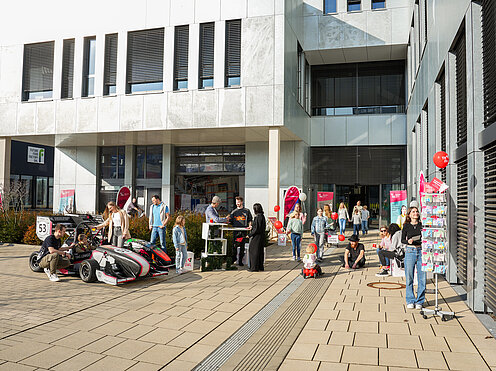 Im Außenbereich zeigte sich der Campus von seiner spielerisch-praktischen Seite: Mit ferngesteuerten Miniaturmaschinen konnten kleine und große Gäste einem Stadtplatz neues Leben einhauchen – und dabei ganz nebenbei aktuelle Fragen der Freiraumplanung des Fachbereichs Landschaftsarchitektur und Umwelplanung, der am Standort Höxter ansässig ist, verstehen lernen.