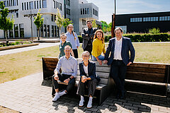 hintere Reihe von links: Kristina Rein (Institut für Wissenschaftsdialog), Yvonne Fischer (Team Lehre und Lernen), Prof. Dr. Josef Löffl (Institut für Wissenschaftsdialog), Julia Wunderlich (Transferförderung) Prof. Dr. Stefan Witte (Vizepräsident für Forschung und Transfer); vorne von links: Nikolas Rolf (TRiNNOVATION), Farina Schmidt-Degenhard (Transferförderung); nicht im Bild: Lisa Mellies (Forschungs- und Transferzentrum), Jessica Kirsch (Projektbüro)