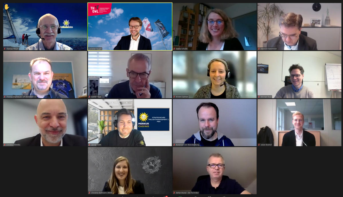 „Aktuelle, spannende Fragestellungen zu bearbeiten und auf Tuchfühlung mit Top-Unternehmen unserer Region zu gehen“, so beschreibt Professor Christian Faupel die Ausrichtung des Moduls „Projektmanagement“, das Studierende im 3. Semester des Masterstudiengangs Management Mittelständischer Unternehmen belegen. Als Initiator dieses praxisorientierten Moduls legt er Wert darauf, dass Studierende frühzeitig lernen, agil auf Veränderungen zu reagieren, effektiv Aufgaben in einem heterogenen Team zu verteilen und Probleme lösungsorientiert anzugehen. Zusammen mit der wissenschaftlichen Mitarbeiterin Saskia Schulte begleitete er auch in diesem Wintersemester wieder vier Gruppen, die in Kooperation mit den Unternehmen Arnzt Optibelt GmbH, Gauselmann AG, Miele & Cie. KG, und Schüco International KG unterschiedliche Projektthemen bearbeiteten. Flankiert wurde diese Aufgabe von Workshops, die die Anwendung von Projektmanagement-Tools und die Stärkung persönlicher Kompetenzen, wie Gesprächsführung und Rhetorik vermittelten.